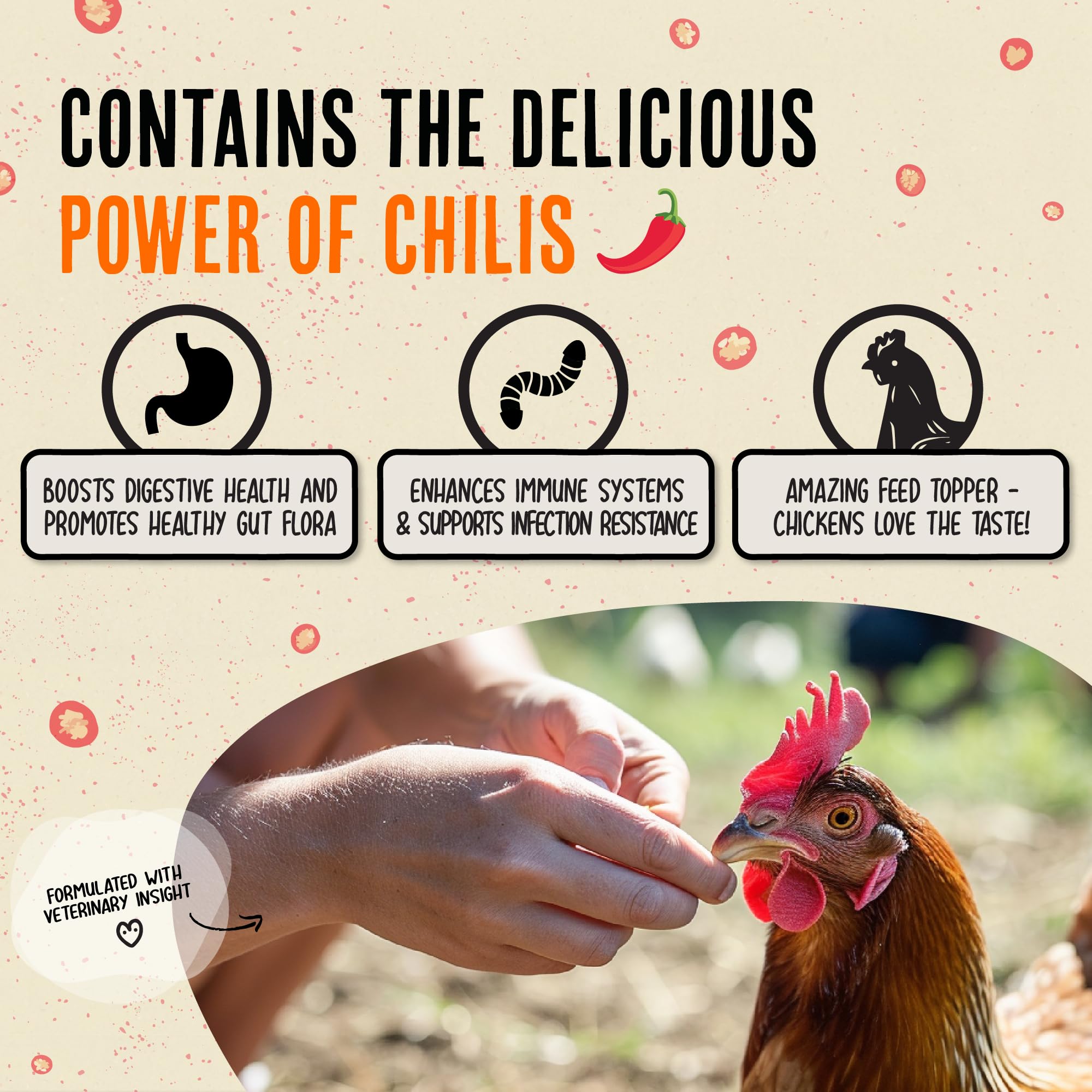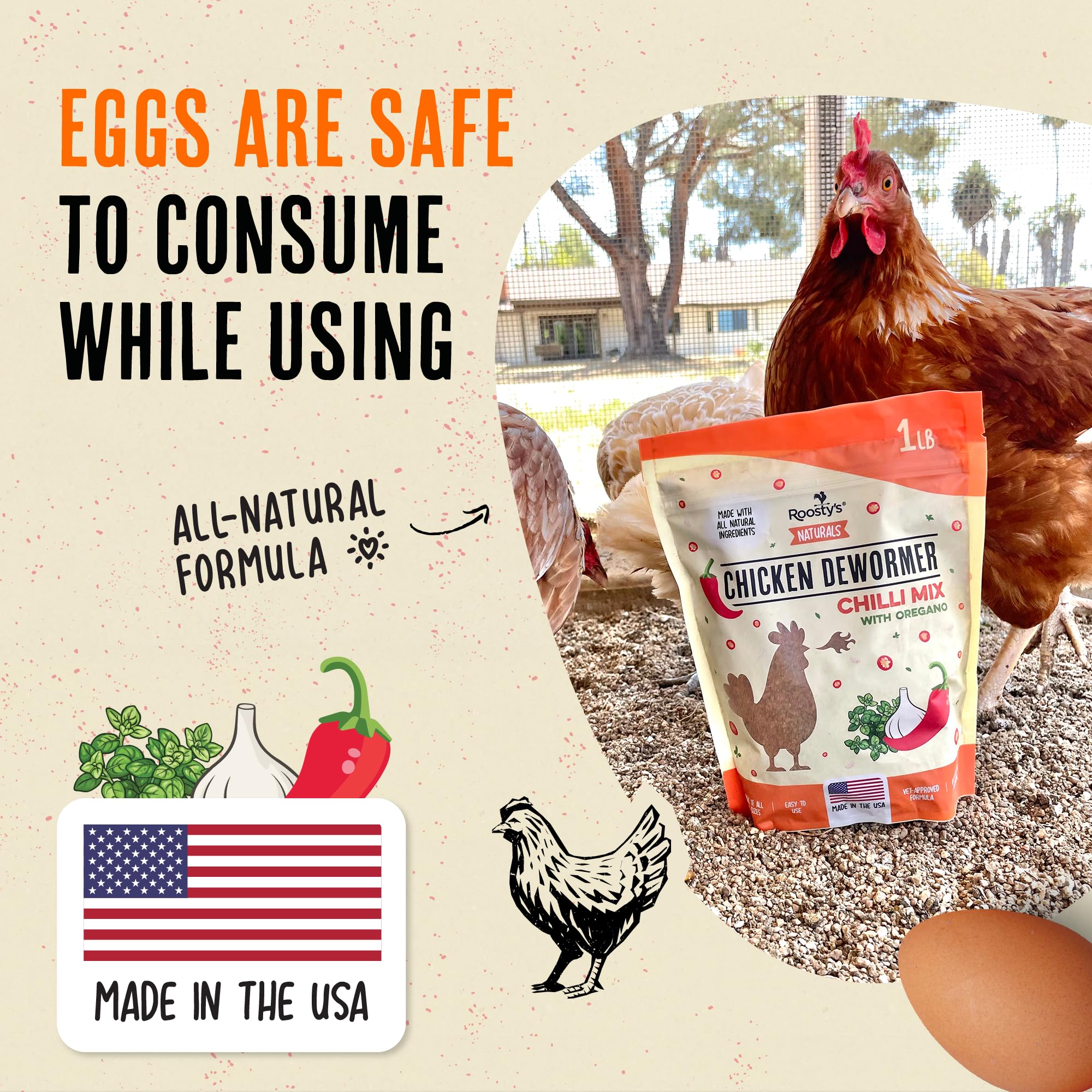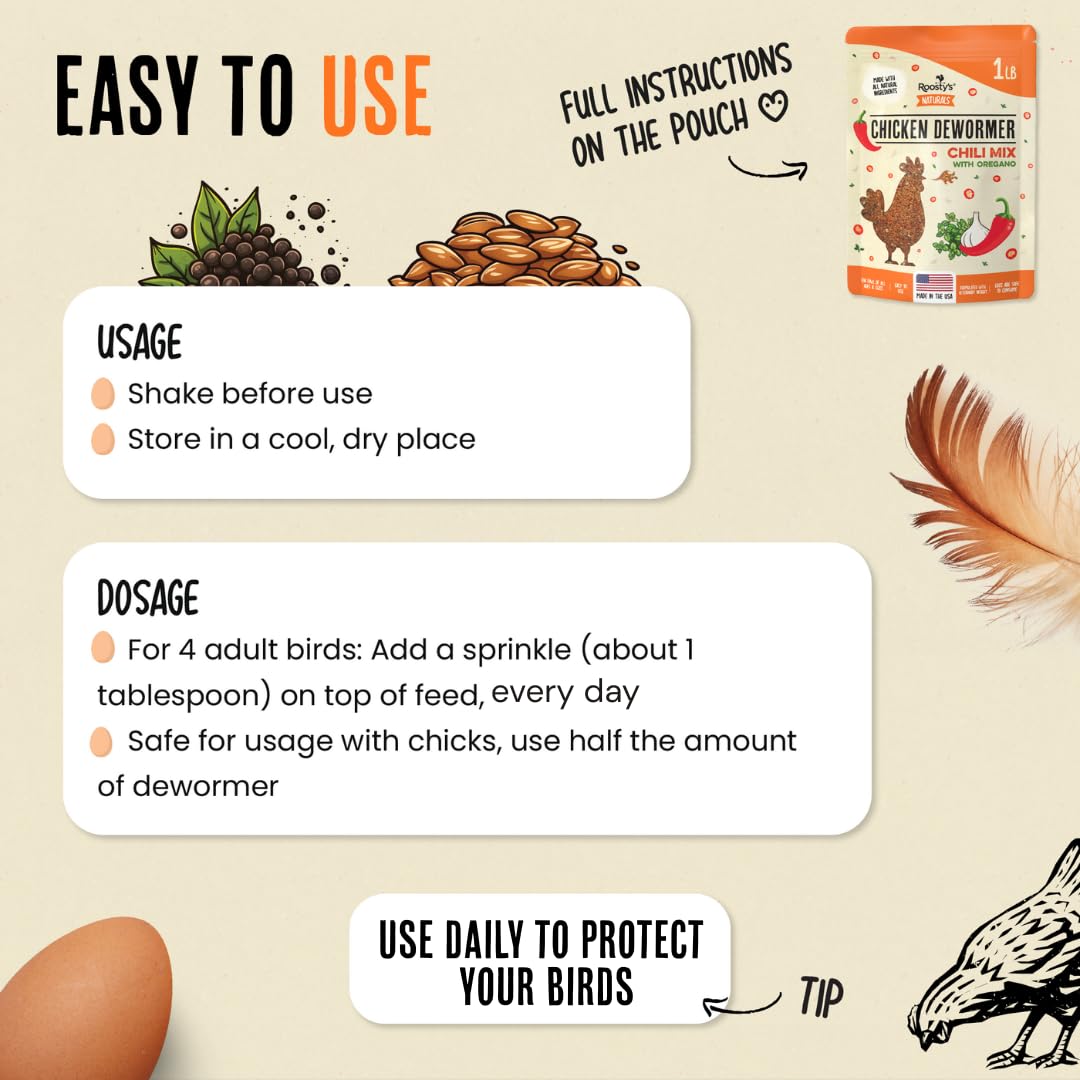 Easy to Use: Just sprinkle some of our delicious chili de-wormer on top of their feed. One sprinkle per chicken daily to protect your flock. For best results use year round as a preventative.
