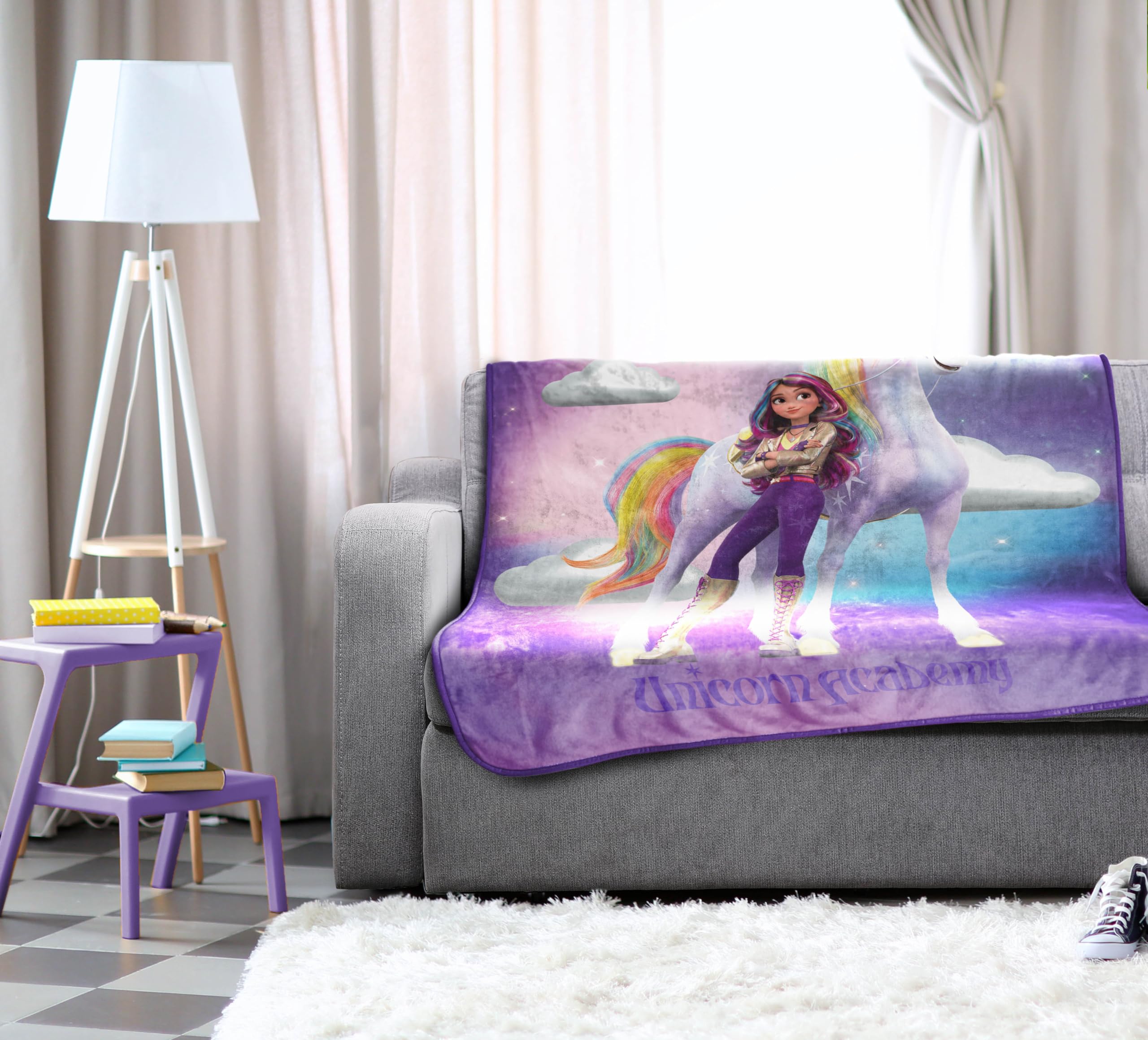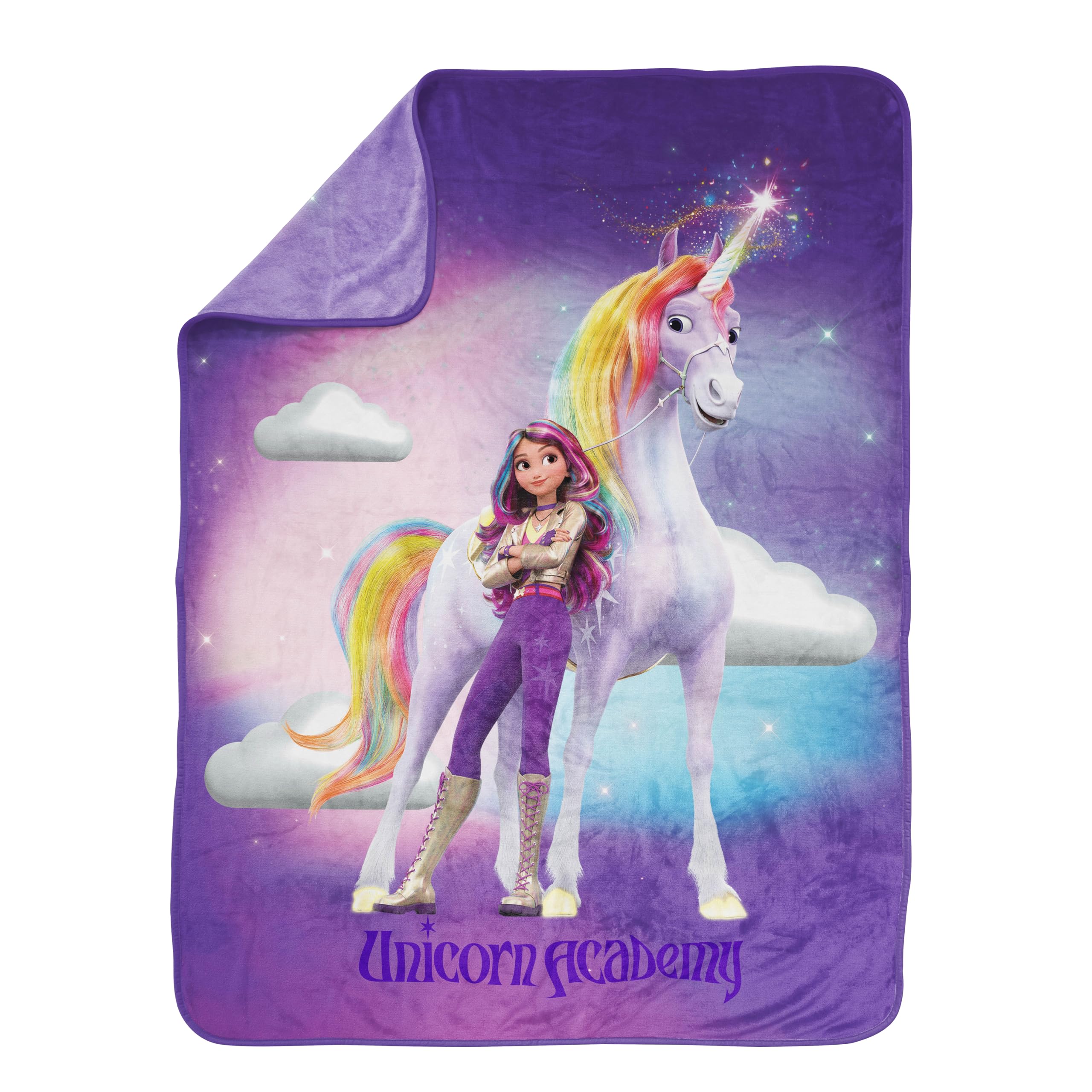 Enjoy the comfort, warmth, and coziness of this Unicorn Academy throw blanket all year round! Ideal for a kid's bedroom, living room or to take in the car for road trips. This super soft and plush blanket featuring Sophia and Wildstar makes the perfect gift, that kids are sure to love. A great choice for tossing over existing bedding for an additional layer during the cold months, or draping over a chair while reading your little one a book. Throw measures 46 x 60 inches. Easy care, machine washable polyester.