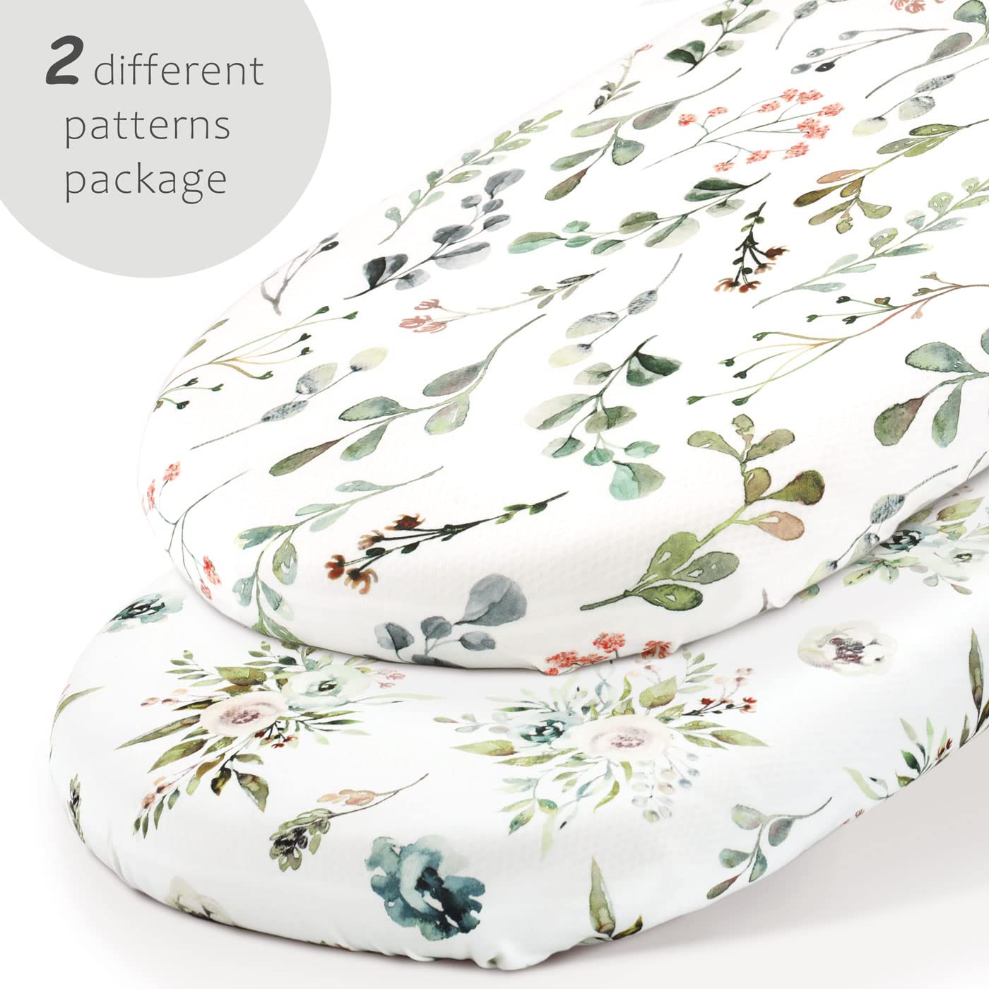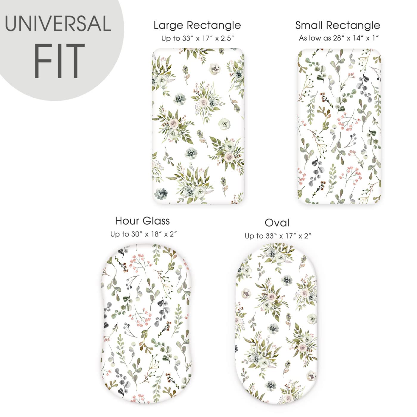 Universal Fit – Measuring 32" x 16" x 5". Our bassinet sheets fit almost all standard oval, round, rectangle, hourglass shaped bassinet mattress. Each bassinet mattress pad cover comes with an elastic band encased at the bottom for safety.