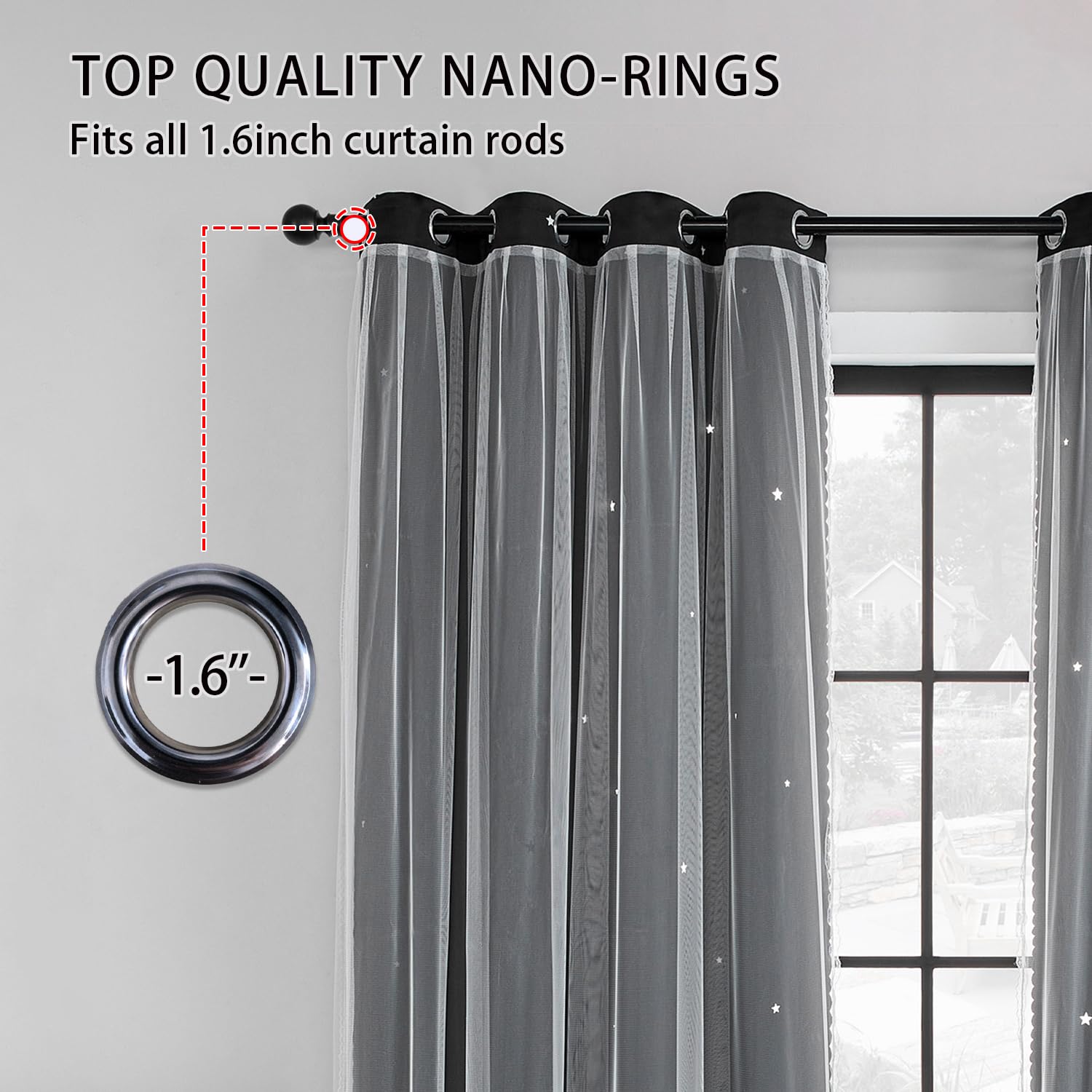 PACKAGE: The package include 2 panels curtain comes with 2 tie, each panel has both the 1 layer of tulle attached 1 layer of gradient star curtain.