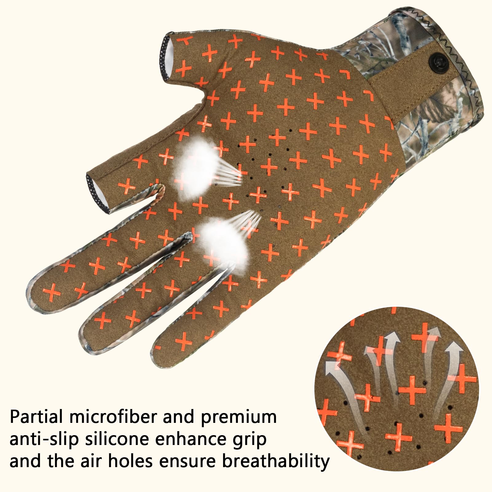 Partial microfiber and premium anti-slip silicone make sure you keep a firm grip on your bow or other hunting tools as well as prevent daily wear and tear; The air holes in the palm ensures breathability; Elastic wrist for a snug and comfortable fit