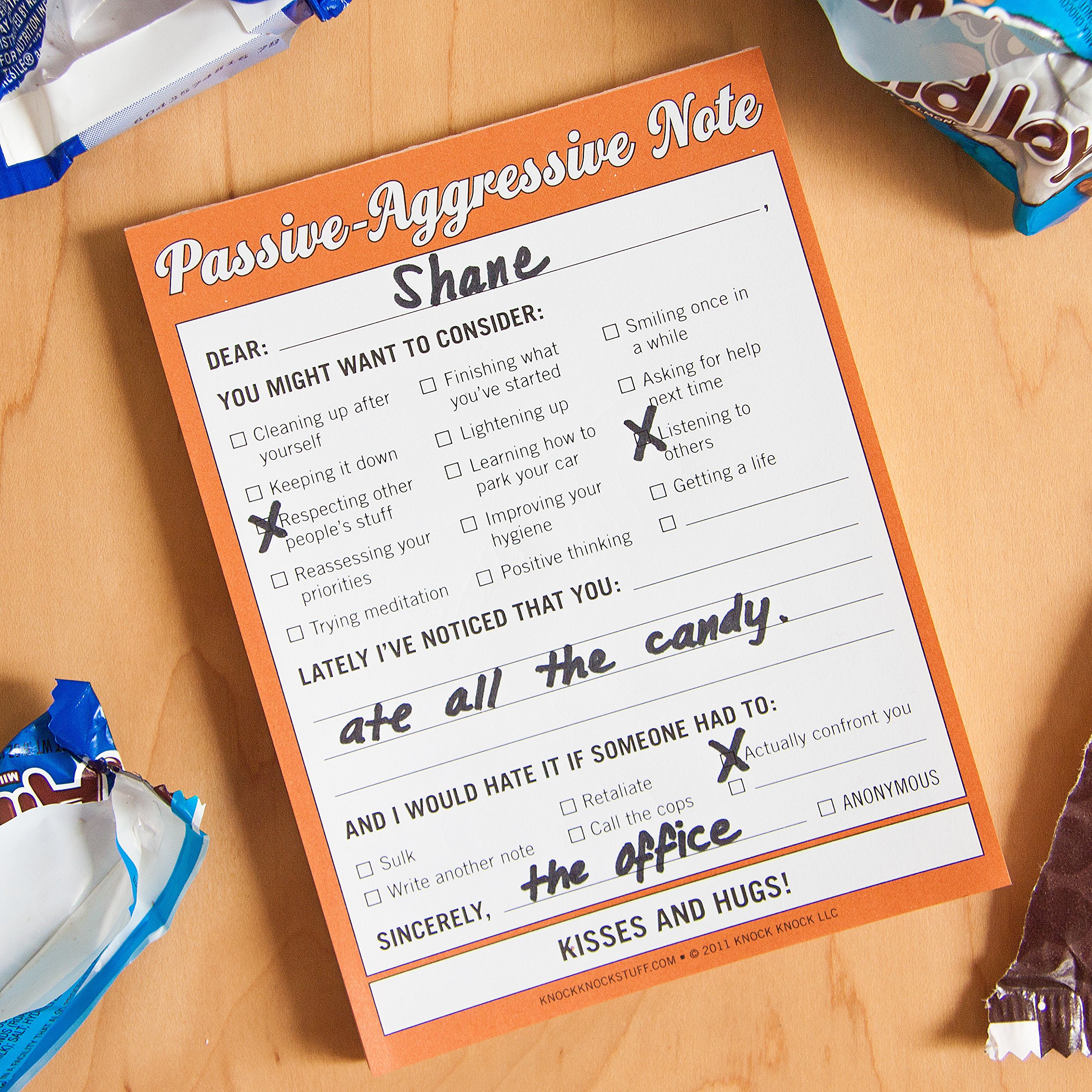Product Description Express yourself the thinly veiled way! This passive-aggressive memo pad lets you clearly but (somewhat) subtly address a range of behavioral failures in others including poor attitude and lackluster hygiene. Great for communication between roommates and frenemies! Make communication sweet and sour! Modern-day etiquette for the masses 4 x 5.25 inches; 50 sheets About the Author KNOCK KNOCK is a maker of products that bring wit, heart, productivity (and occasional light profanity) to everyday life. Our pads, planners, journals, and books help people accomplish their goals, express their feelings, and laugh at the absurdity of modern existence. We live by (at least) two mottos: “We Put the Fun in Functional” and “Make a List—You’ll Feel Better.” We consider list-making and laughter to be essential forms of self-care. (And, obvs, we love mottos.)