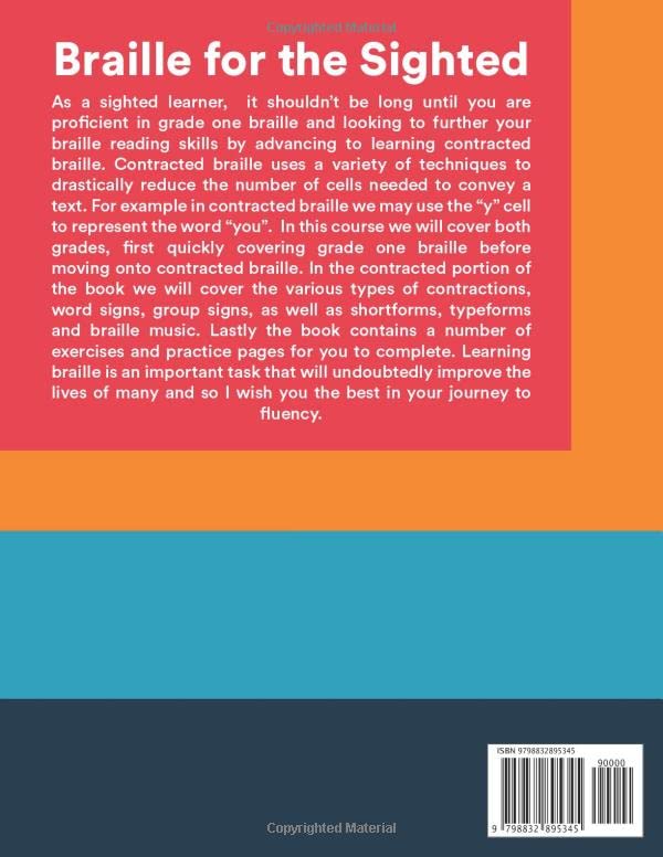 PLEASE NOTE THAT THIS BOOK DOES NOT CONTAIN RAISED BRAILLE. Hello and welcome to Braille for the Sighted (Grade one + Grade two): A course in contracted braille. As a sighted learner, it shouldn’t be long until you are proficient in grade one braille and looking to further your braille reading skills by advancing to learning contracted braille (also known as grade two braille). Contracted braille uses a variety of techniques to drastically reduce the number of cells needed to convey a text. For example in contracted braille we may use the “y” cell to represent the word “you”. In this course we will cover both grades, first quickly covering grade one braille before moving onto contracted braille. In the contracted portion of the book we will cover the various types of… contractions word signs group signs as well as… shortforms typeforms braille music Lastly the book contains a number of exercises and practice pages for you to complete. Learning braille is an important task that will undoubtedly improve the lives of many and so I wish you the best in your journey to fluency.