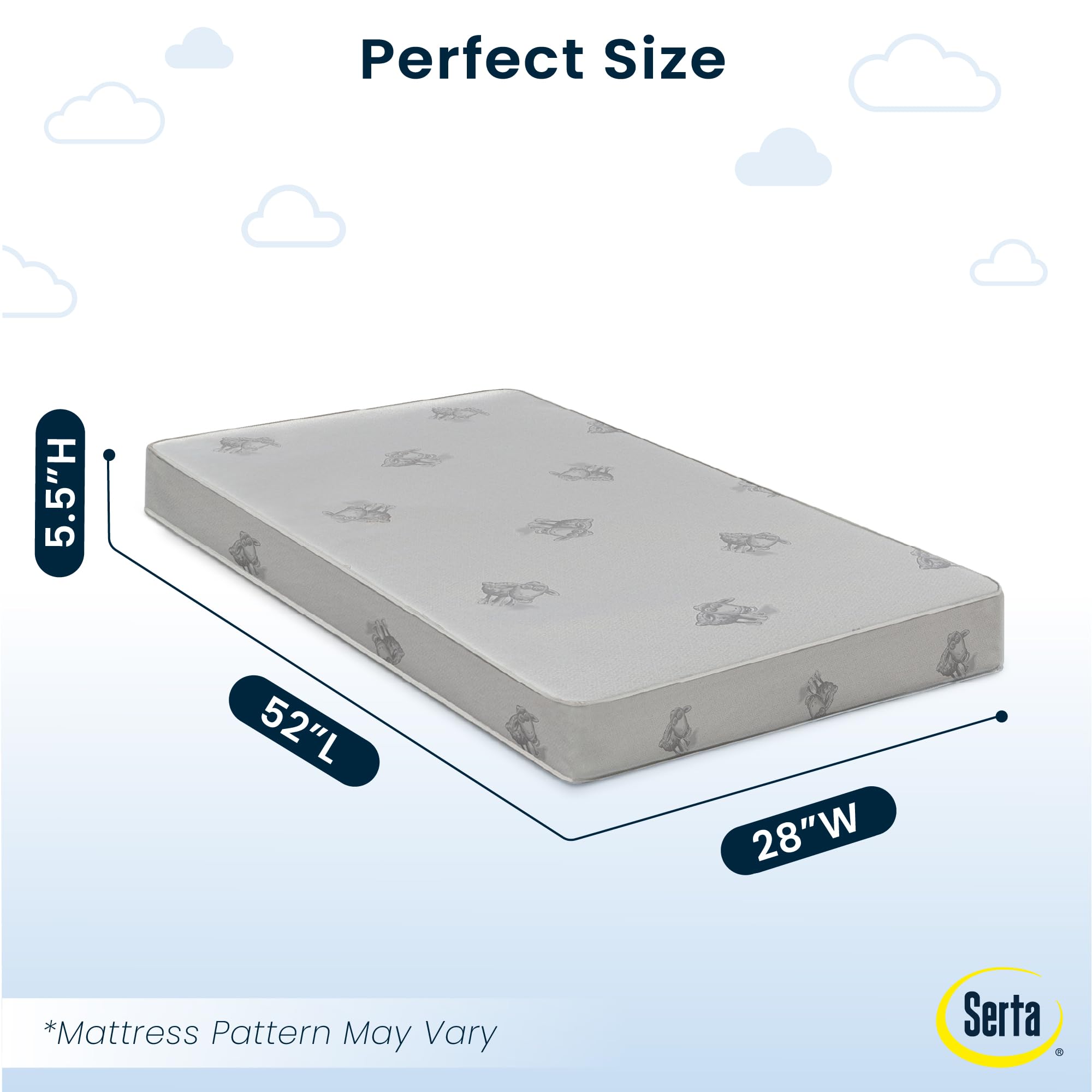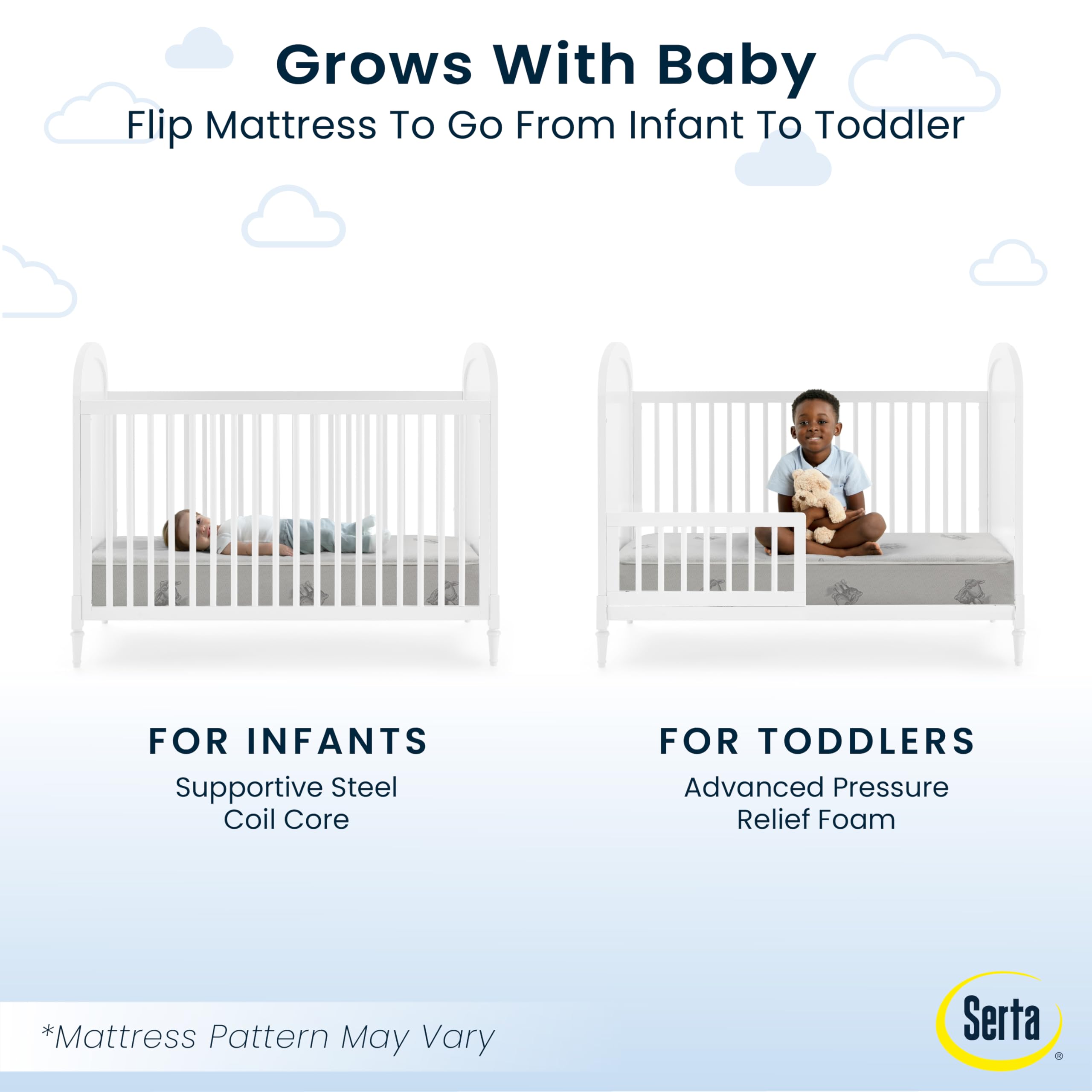 Serta's Perfect Start Deluxe Limited Crib and Toddler Mattress combines supportive steel coils and pressure point relief to create the perfect hybrid of comfort and durability for your little one. At the core of this baby mattress, 220 coils provide balanced support throughout the whole mattress. Two distinct sides deliver targeted comfort for newborns and toddlers. The infant side is the ideal firmness level for newborns and the toddler side features a layer of foam for advanced pressure point relief. A waterproof vinyl cover ensures easy cleanup. The Serta Perfect Start Deluxe Limited Crib and Toddler Mattress is a great option for your baby’s crib or toddler bed. Pattern on mattress cover may vary. All Serta crib mattresses are GREENGUARD Gold Certified and meet the strictest standards offered by the GREENGUARD Environmental Institute, which recognizes products with low chemical emissions, contributing to improved indoor air quality.