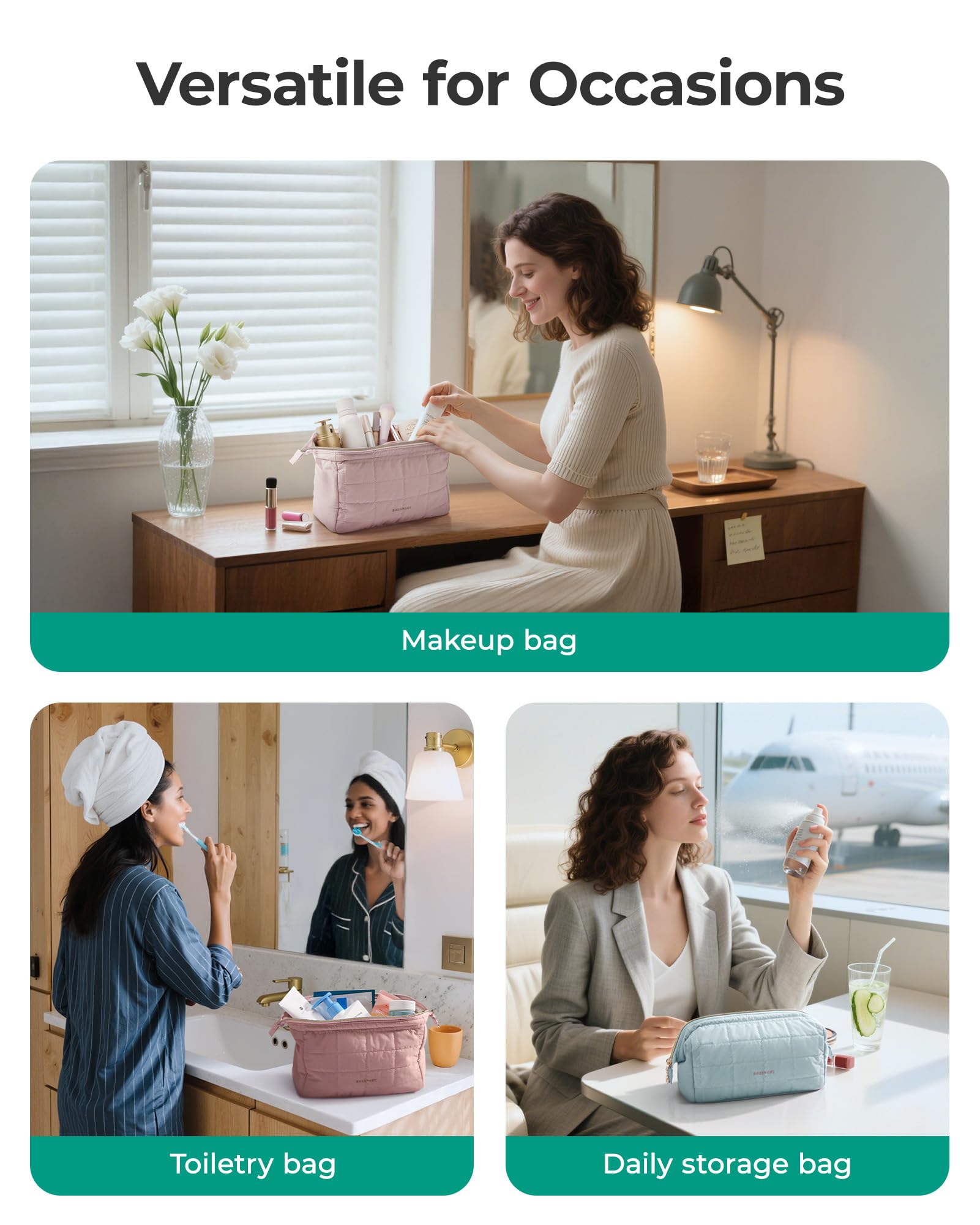 【CONVENIENT DESIGN】- The wide opening design of this makeup bag allows for effortless access to all your beauty essentials. Say goodbye to wasting time searching through tiny cosmetic bags. With this women's toiletry bag, you can quickly find your desired cosmetics like lipstick or eyeshadow