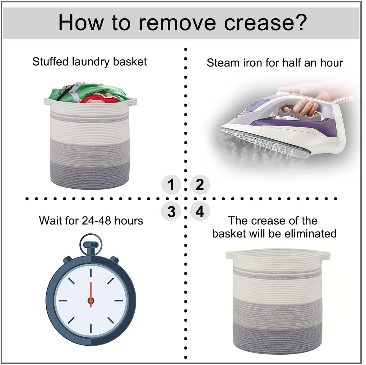Washable Large Basket: This large basket can be washed by hand or machine with gentle detergent. If machine washed, please put them into a laundry bag. NOTE: These cotton rope baskets are folded when shipping, but it will turn back to its elegant shape quickly if you fill it with some towels or clothing, and iron is great idea to remove the creases