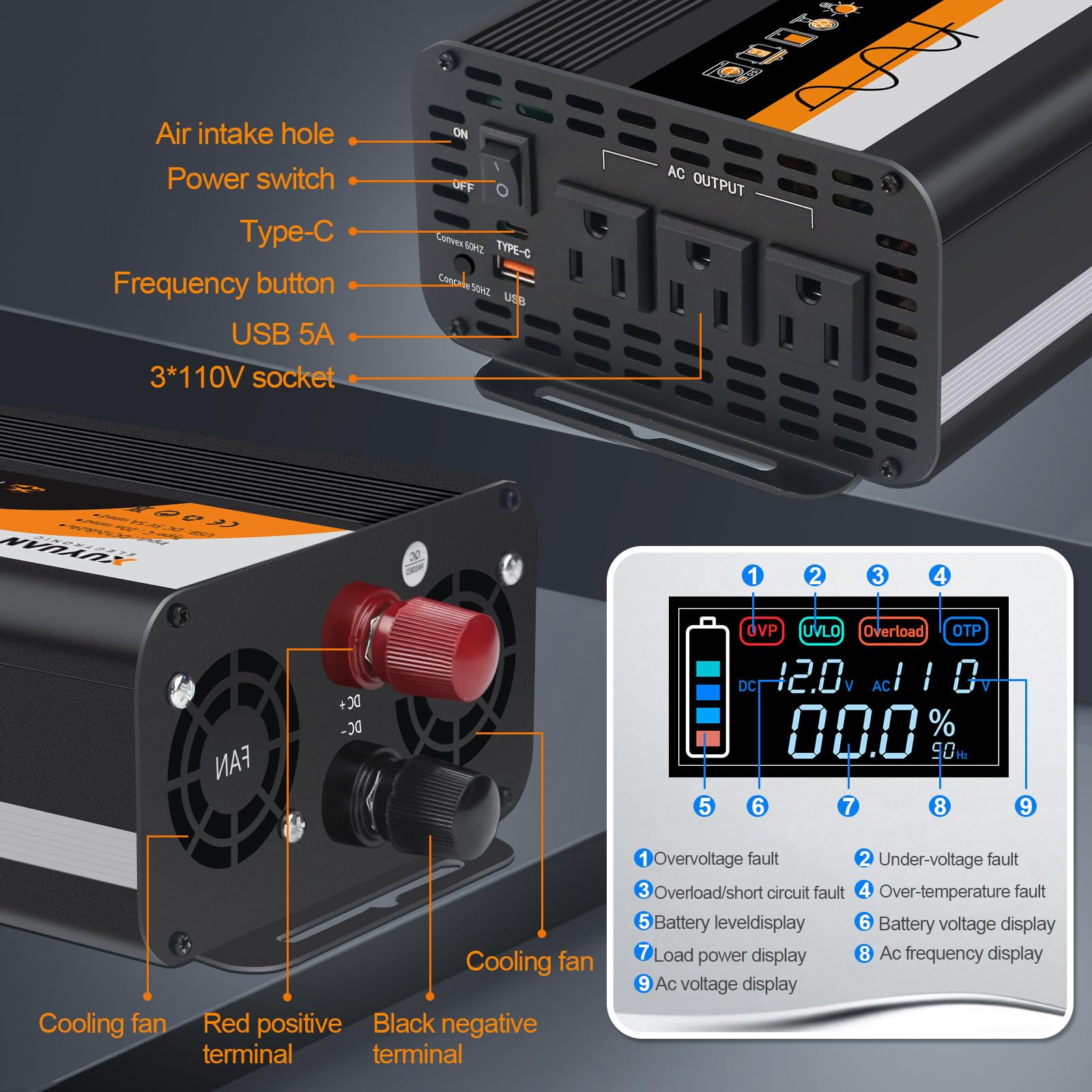 Smart LCD Display & Auto-Detect: Color LCD shows battery/output voltage and fault codes; auto-detects 12V/24V input and allows 50Hz/60Hz output switching for global compatibility, Battery reverse polarity protection prevents damage without fuse replacement; includes overload, overheat, overcharge, discharge, and short-circuit safeguards