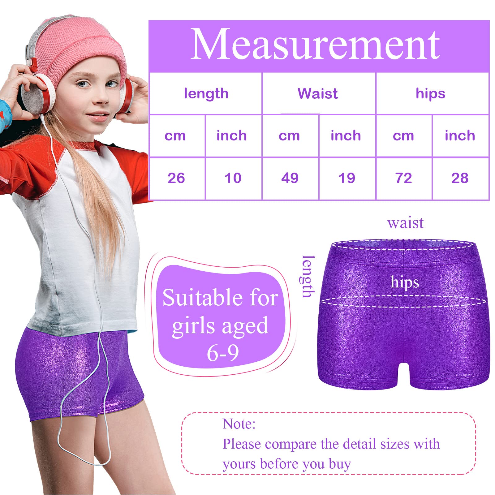 Fit Girls Aged 6-9: the gymnastics shorts for girls measure approx. 10.24 inches/ 26 cm long, 19.3 inches/ 49 cm in waist circumference, and 28.35 inches/ 72 cm in hip circumference, suitable for girls aged 6-9, or girls of approx. 4.6 feet/ 140 cm tall