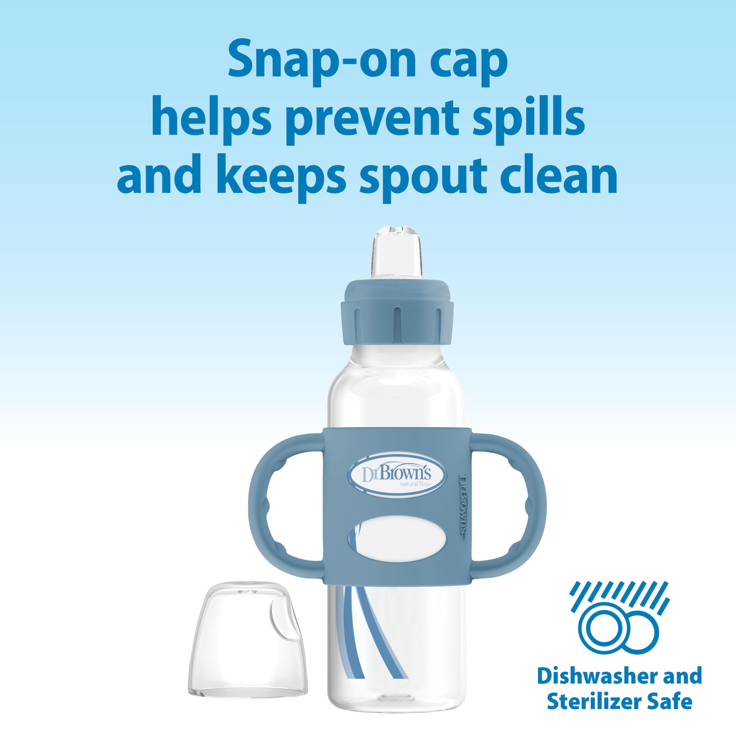 Easy to grip, easy to sip! Dr. Brown’s® Milestones™ Sippy Bottle with silicone handles is the perfect first step for baby’s transition from bottle to cup. Introducing a sippy spout has never been simpler. The soft silicone sippy spout is used in place of the nipple on the Dr. Brown’s bottle that’s already familiar to baby. Easy grip 100% flexible silicone handles are removable and fit most narrow bottles, while the snap-on cap keeps the spout clean when on-the-go. The soft sippy spout fits any Dr. Brown’s® Options+™ Narrow bottle after the internal vent is removed. All parts are safe for use in dishwasher (top rack only), electric and microwave sterilizers or boiling water. 6m+.