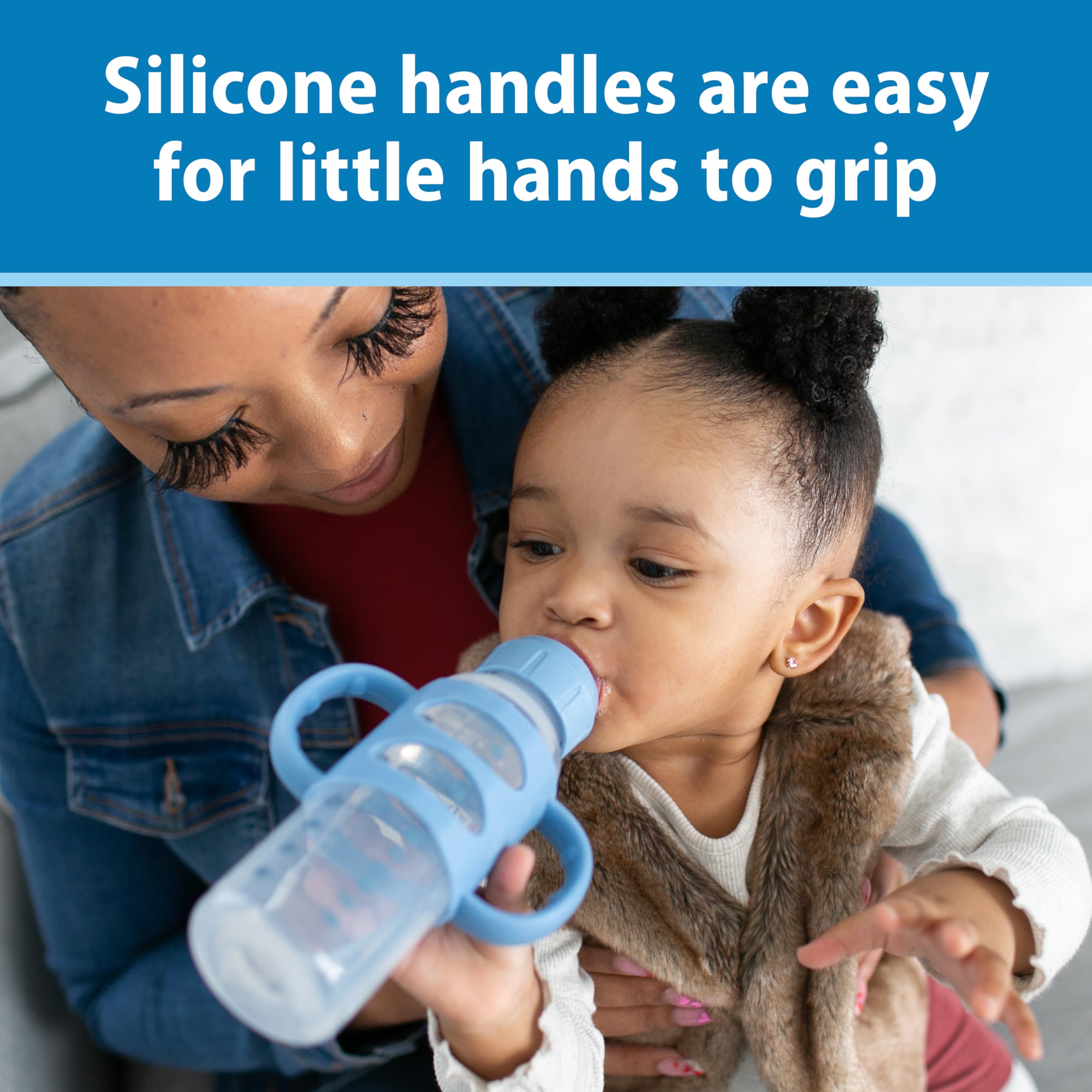 SIPPY BOTTLE WITH HANDLES. Easy grip removable 100% silicone handles are flexible and easy to hold. Bottle handles are interchangeable and fit most other narrow bottles.