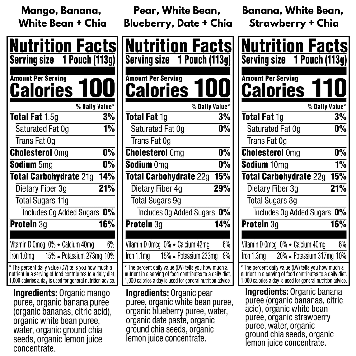 MADE WITH NATURAL FLAVORS: Mango, Banana, White Bean, and Chia, Pear, White Bean, Blueberry, Date, and Chia, and Banana, White Bean, Strawberry, and Chia blends made with organic purees