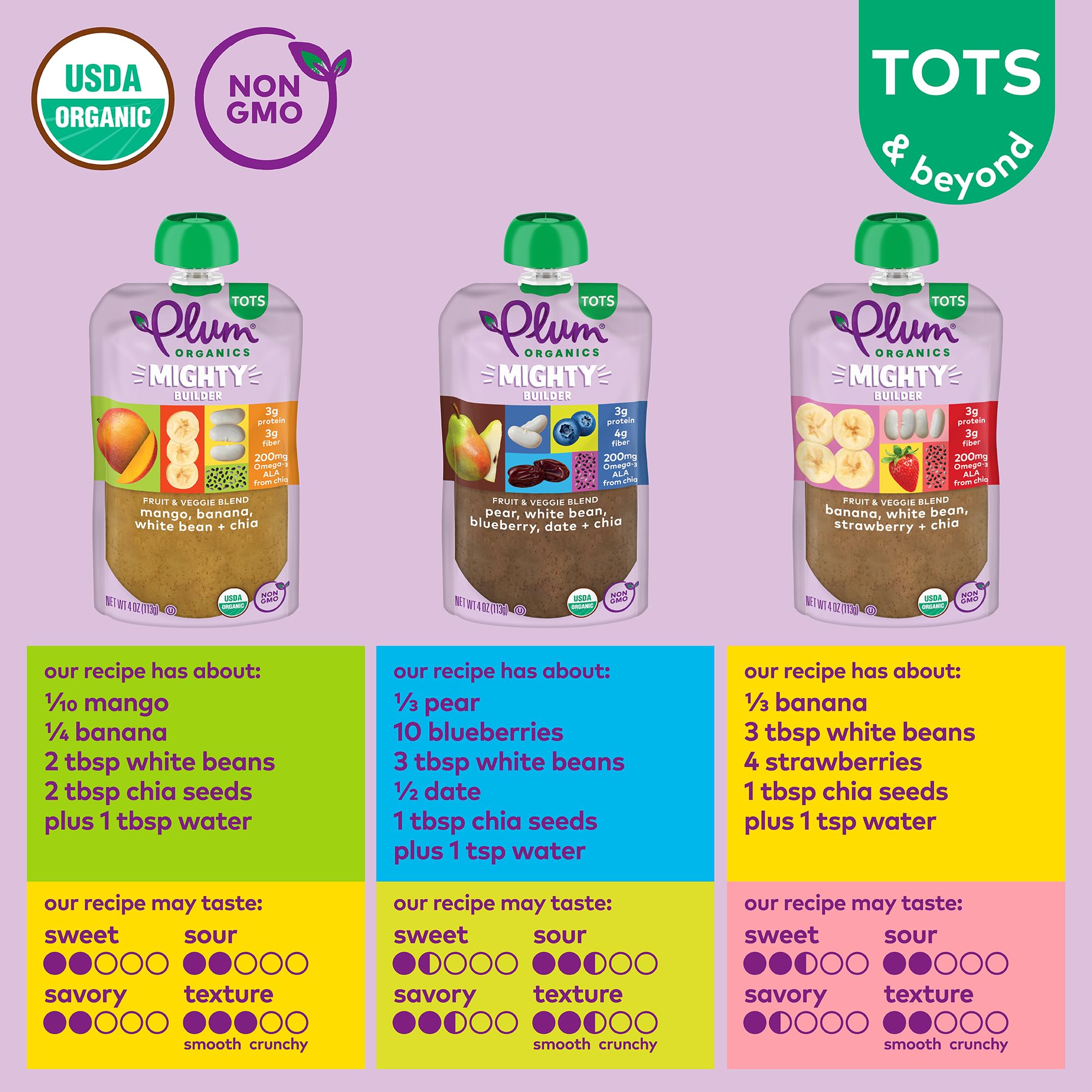 Mighty Blends for a Mighty Toddler. Plum Organics Mighty Builder Blends are filled with organic fruits, veggies, and seeds for the perfect snack to fuel your active toddler. Our Mango, Banana, White Bean, and Chia blend, Pear, White Bean, Blueberry, Date, and Chia blend, and Banana, White Bean, Strawberry, and Chia blend are each made with non-GMO, organic ingredients for an organic toddler food that your toddler will love. Our Plum Organics pouches are naturally preserved, unsalted, unsweetened, and kosher parve. And since our baby food pouches are convenient, portable, and resealable, you can customize portion sizes, whether you're at home or you need a simple snack on the go.