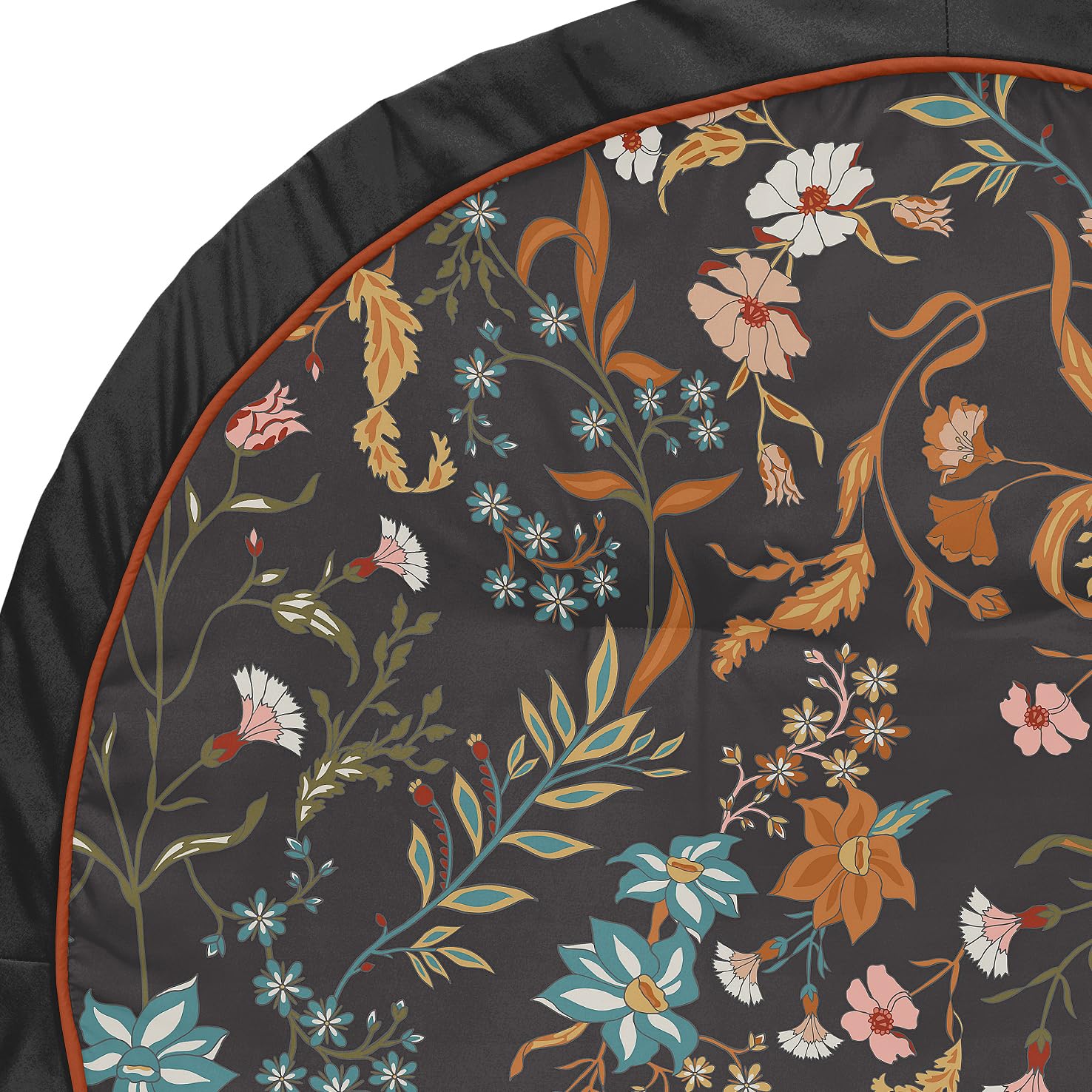 This brushed microfiber newborn play mat is designed using a black, rust orange, teal turquoise blue, green, pink and yellow bohemian farmhouse daisy leaves botanical paisley leaf flower garden cottagecore indie rustic boho wildflower vintage floral print and finished with rust orange piping and black border.