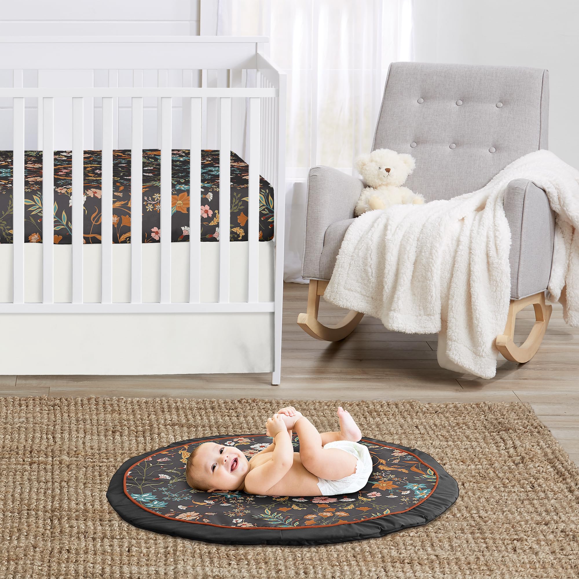 This lightly padded floor mat is the perfect addition to any nursery or baby room to help the development of crawling and standing for your little one! A round infant floor mat can be used in baby nurseries, play rooms, play pens, playhouse, livingroom, bed room, apartment, play yard, or home office during tummy time to get your new addition comfortable with crawling and getting practice in standing and eventually walking.