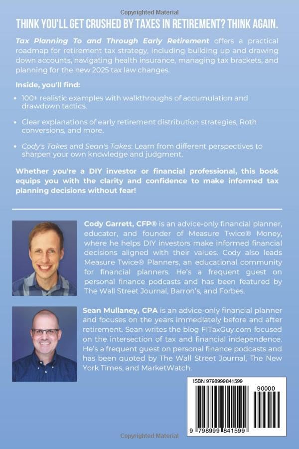 Thinking about early retirement? Learn saving and drawdown strategies to guide you to and through early retirement with confidence. Cody Garrett, CFPĀ®, and Sean Mullaney, CPA, cut through the jargon to share strategies and tactics to reduce total lifetime taxes and accelerate the path to early retirement. Too often, we hear: "Taxes will crush your retirement!" Tax Planning To and Through Early Retirement tackles those concerns head-on. The book explains how to build retirement savings and lower taxes during the working years, then explores drawdown approaches designed to help minimize taxes throughout retirement. You'll learn how to: - Navigate IRAs, 401(k)s, and other key retirement accounts - Apply the "Compelling Three" tactics to build retirement savings during your working years - Implement drawdown tactics for all phases of retirement, including Roth conversions and qualified charitable distributions - Avoid or minimize the 10% early withdrawal penalty before age 591/2 - Adjust for the new 2025 tax laws for retirees from the One Big Beautiful Bill - Plan for uncertainty around future tax law changes - Handle RMDs and the dreaded Widow's Tax Trap Inside, you'll find: - 100+ realistic examples with detailed walkthroughs of both accumulation and drawdown tactics - Clear explanations of early retirement distribution rules and advanced tax strategies - Cody's Takes and Sean's Takes - two perspectives to sharpen your own judgment Whether you're a do-it-yourself investor or a financial professional, this book equips you with the clarity and confidence to make informed tax planning decisions-without fear.