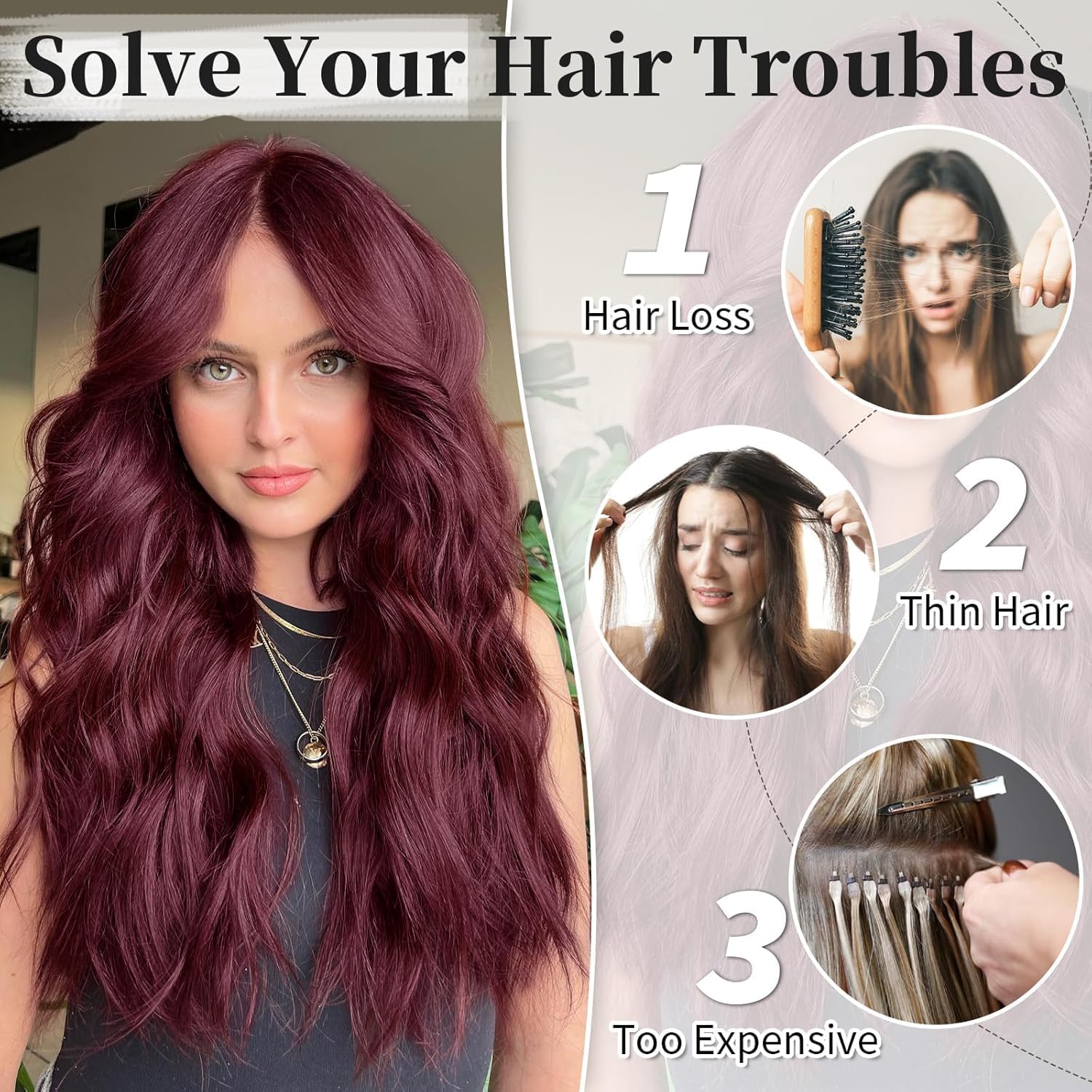 Different ways of wearing: 1. Position the wire hair extensions on your head like a hairdband, secure them with 4 clips, and hide the wires with your own hair.2. Only use invisible wires, suitable for easy hair loss and sensitive to bobby pins customers. 3. Only use 4 hair clips, suitable for customers with soft and sparse hair on the top of the head.It can meet various wearing situations.