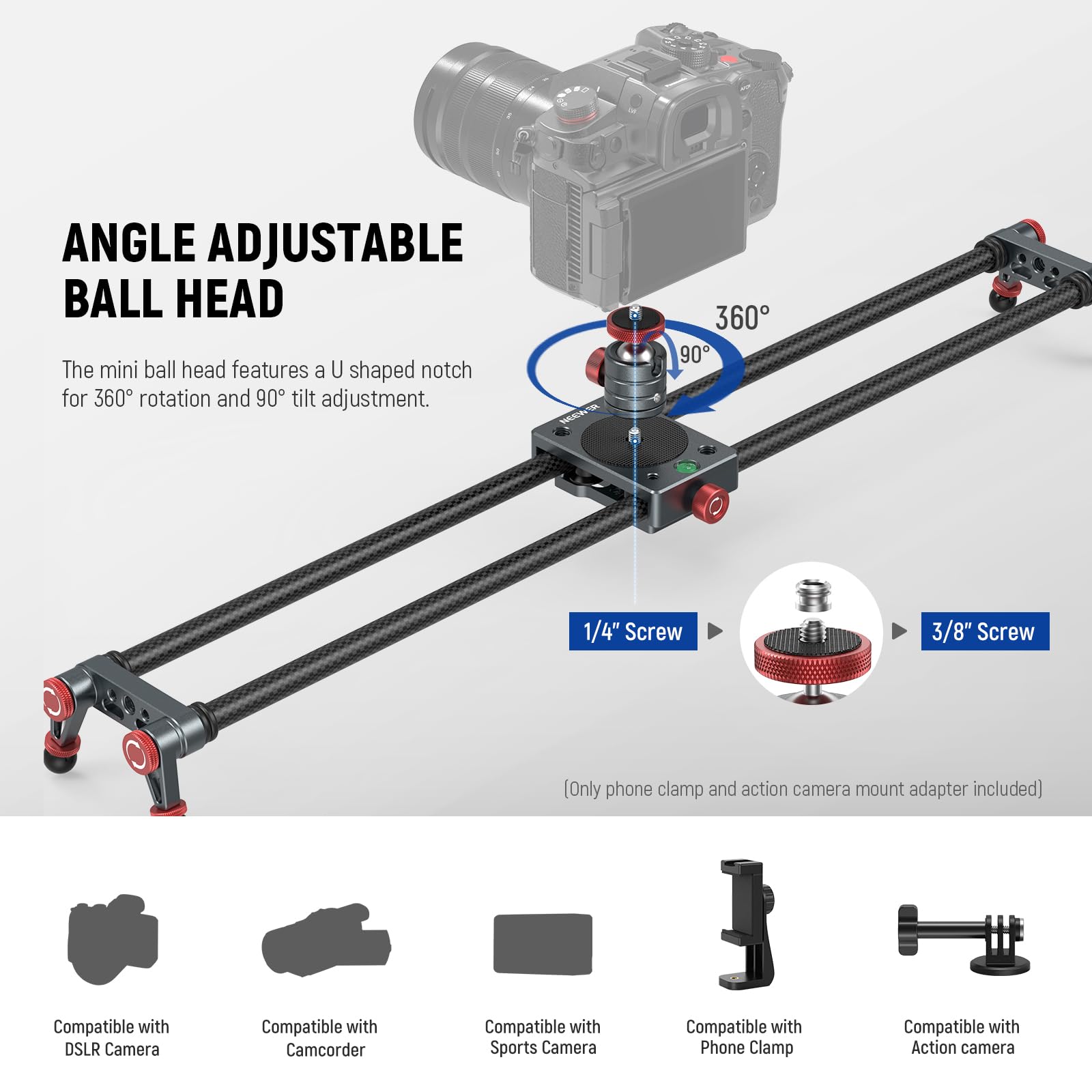 【Angle Adjustable Ball Head】 The mini ball head with a U shaped notch for 360° rotation and 90° tilt adjustment. A top 1/4" screw is compatible with Canon Nikon Sony Fujifilm Fuji Panasonic Samsung DSLR digital cameras, DV Camcorders, mirrorless cameras, action cameras, smartphones (Only phone clamp and action camera mount adapter accessories included), and more