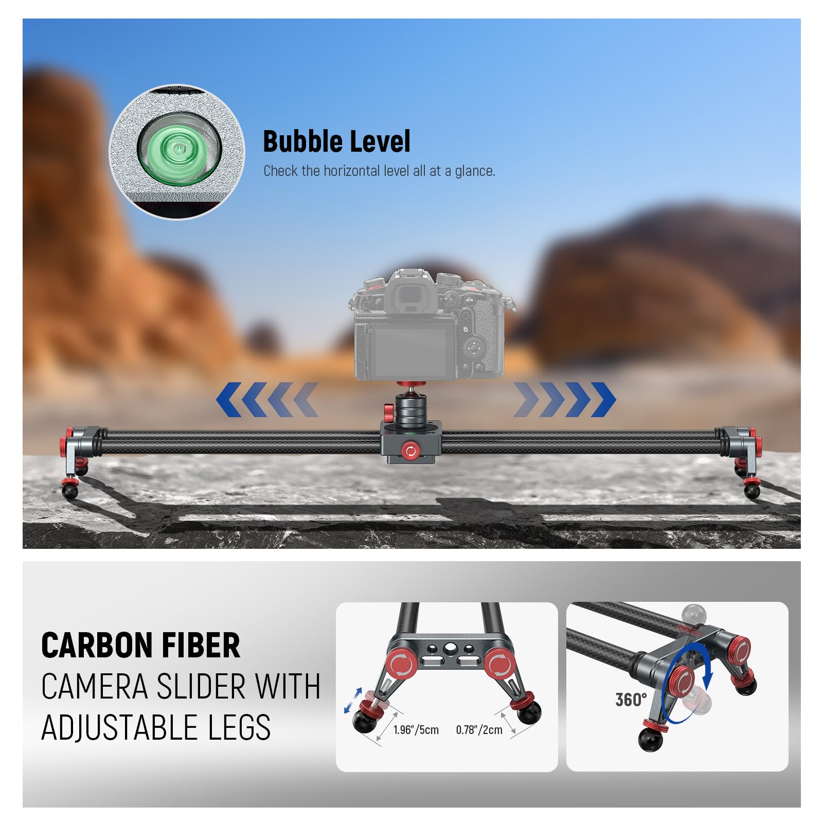 【Carbon Fiber Camera Slider with Adjustable Legs】 Made of carbon fiber and aluminum alloy, this dolly track camera slider stably supports supports up to 4.4lb/2kg horizontally, 2.2lb/1kg at a 45° tilt, and 2.2lb/1kg vertically. The upgraded 360° adjustable legs allow for more flexible angles and can be elevated from 2 to 5cm for optimal balance on uneven terrains. The bubble level swiftly checks the horizontal alignment
