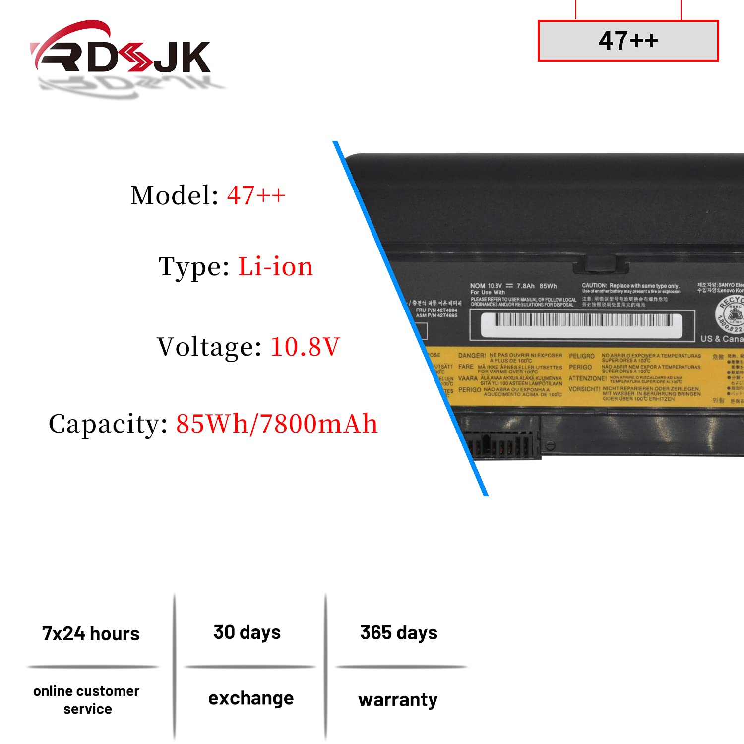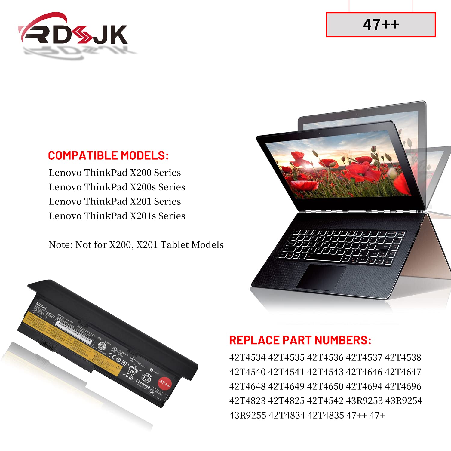 Battery Type: Li-ion; Voltage: 10.8V; Capacity: 85Wh; Color: Black Compatible Machine Models: Fit for Lenovo ThinkPad X200 Series Fit for Lenovo ThinkPad X200s Series Fit for Lenovo ThinkPad X201 Series Fit for Lenovo ThinkPad X201s Series Note: Not for X200, X201 Tablet Models Compatible Part Numbers: 42T4534 42T4536 42T4537 42T4538 42T4540 42T4543 42T4646 42T4647 42T4648 42T4649 42T4650 42T4694 42T4696 42T4823 42T4825 42T4542 43R9253 43R9254 43R9255 47++ 47+ Note: Please check if this battery is compatible with your computer before purchasing. If you are not sure for that, please contact us!
