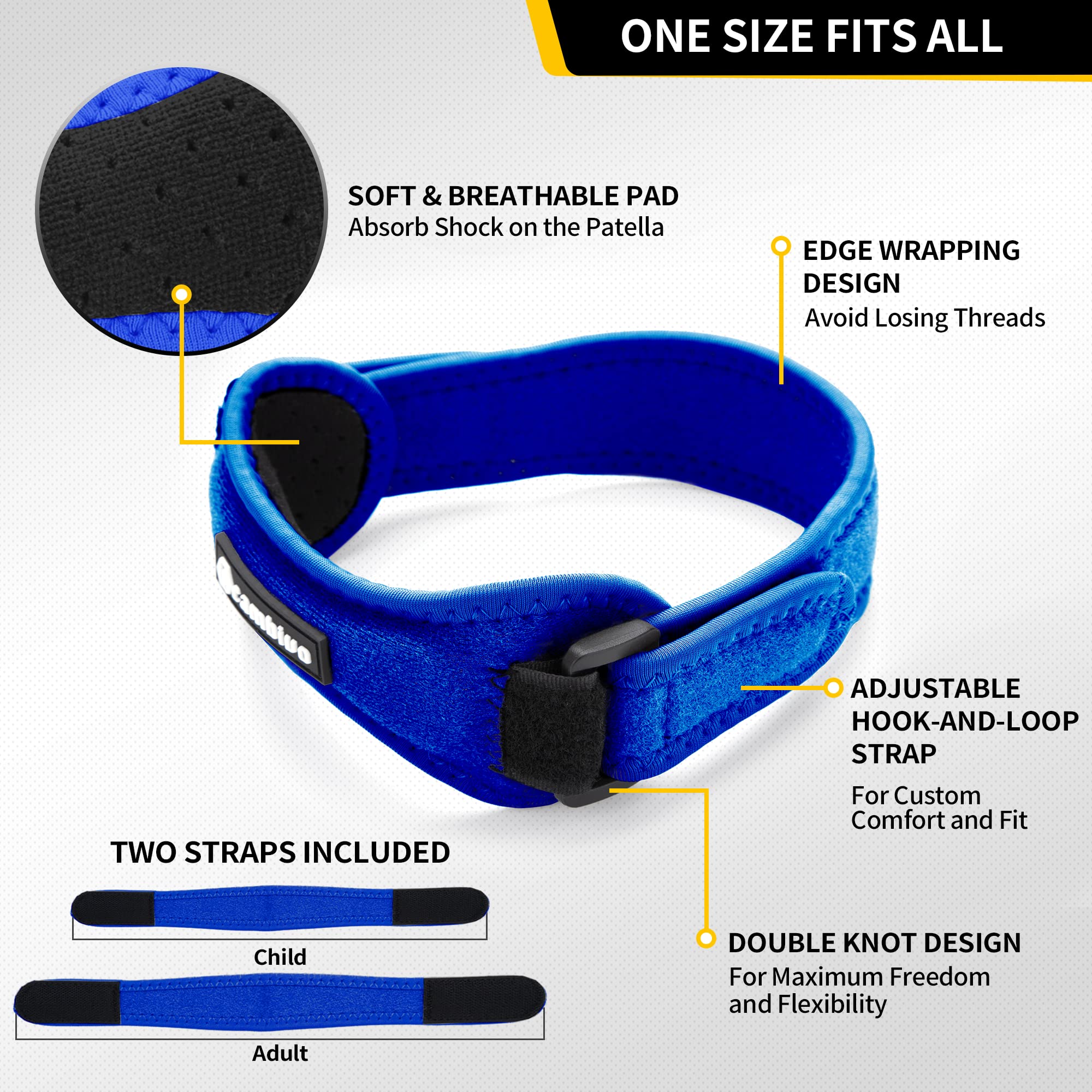 Patellar Tendon Support Strap: Double-knot Design; Fully adjustable; High-quality material; It is designed to apply constant pressure to the patellar tendon, and provide support to the knee; Additionally, it corrects the misalignment and bolsters stability