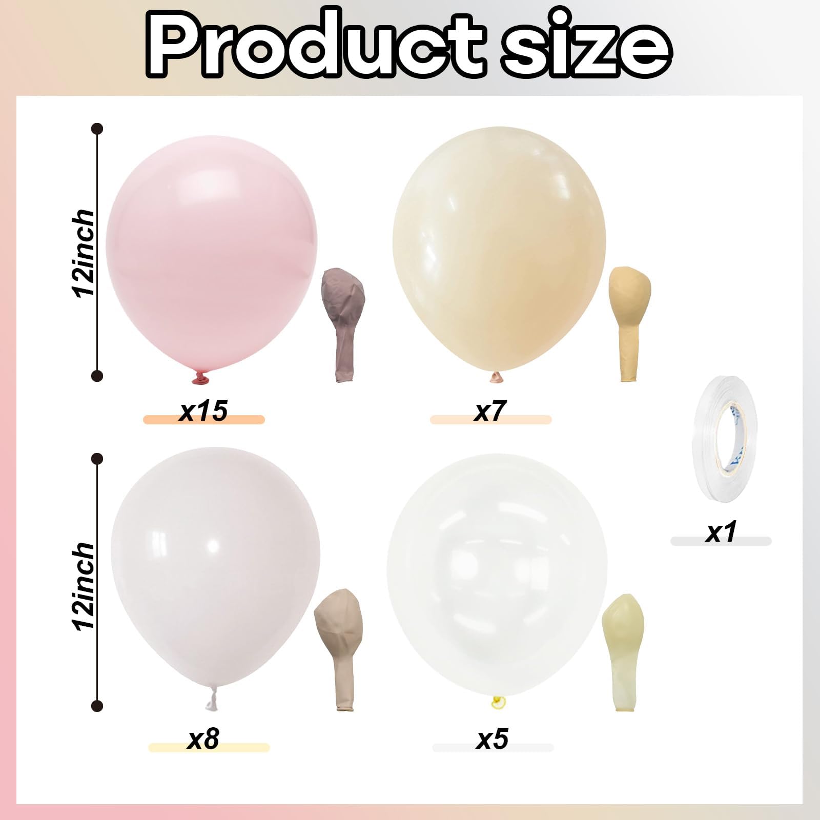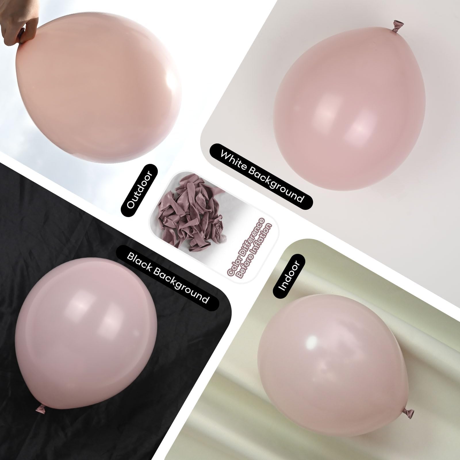 Please Note: THE COLOR OF BALLOONS BEFORE INFLATION MAY APPEAR DARKER OR DIFFERENT FROM THE IMAGES SHOWN, ESPECIALLY FOR DUSTY PINK AND SAND WHITE BALLOONS. ONCE INFLATED, THE COLORS WILL BECOME LIGHTER AND MORE CLOSELY RESEMBLE THE PRODUCT PHOTOS. For best results, we recommend inflating white and pink balloons to about 90% capacity.