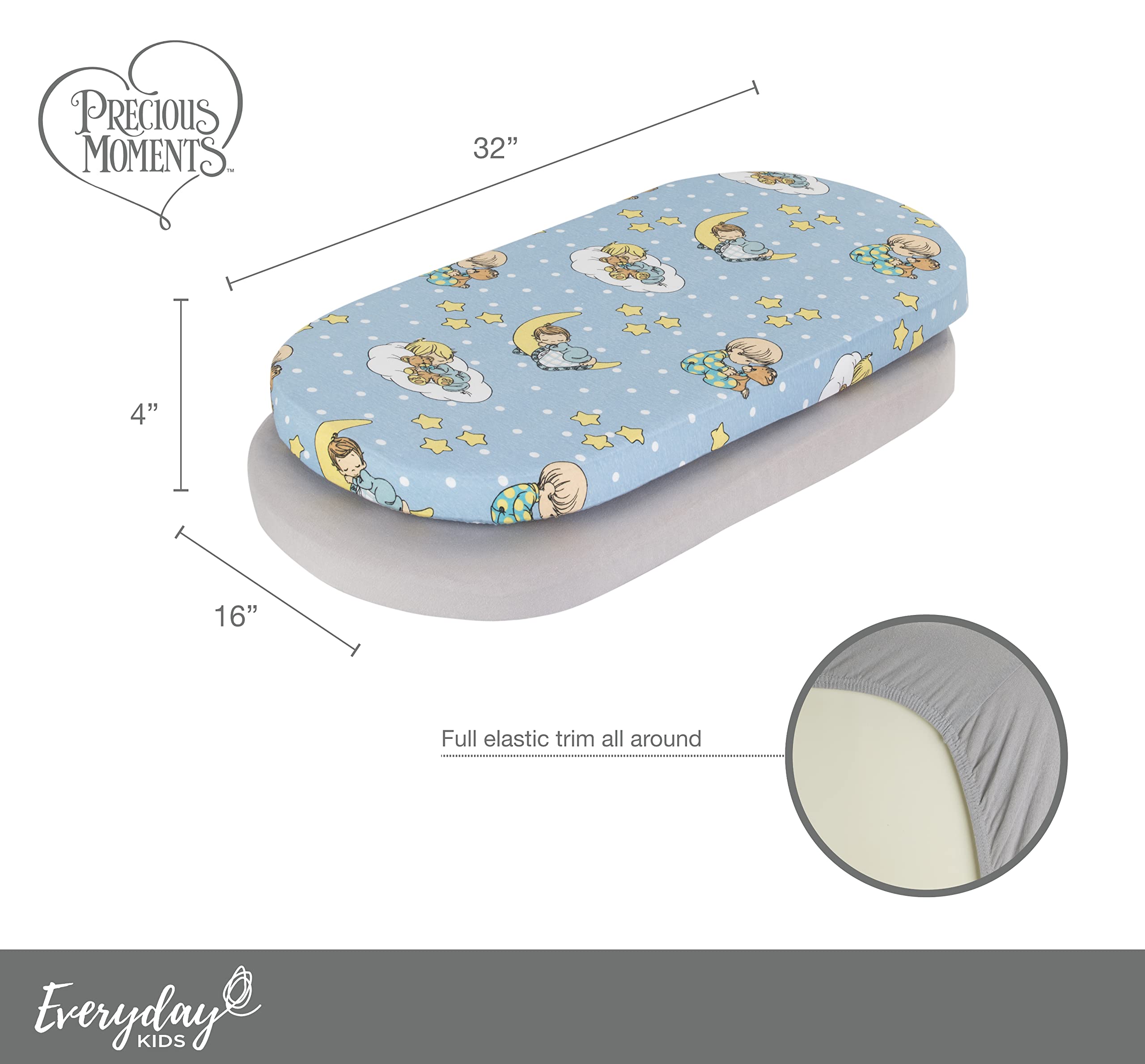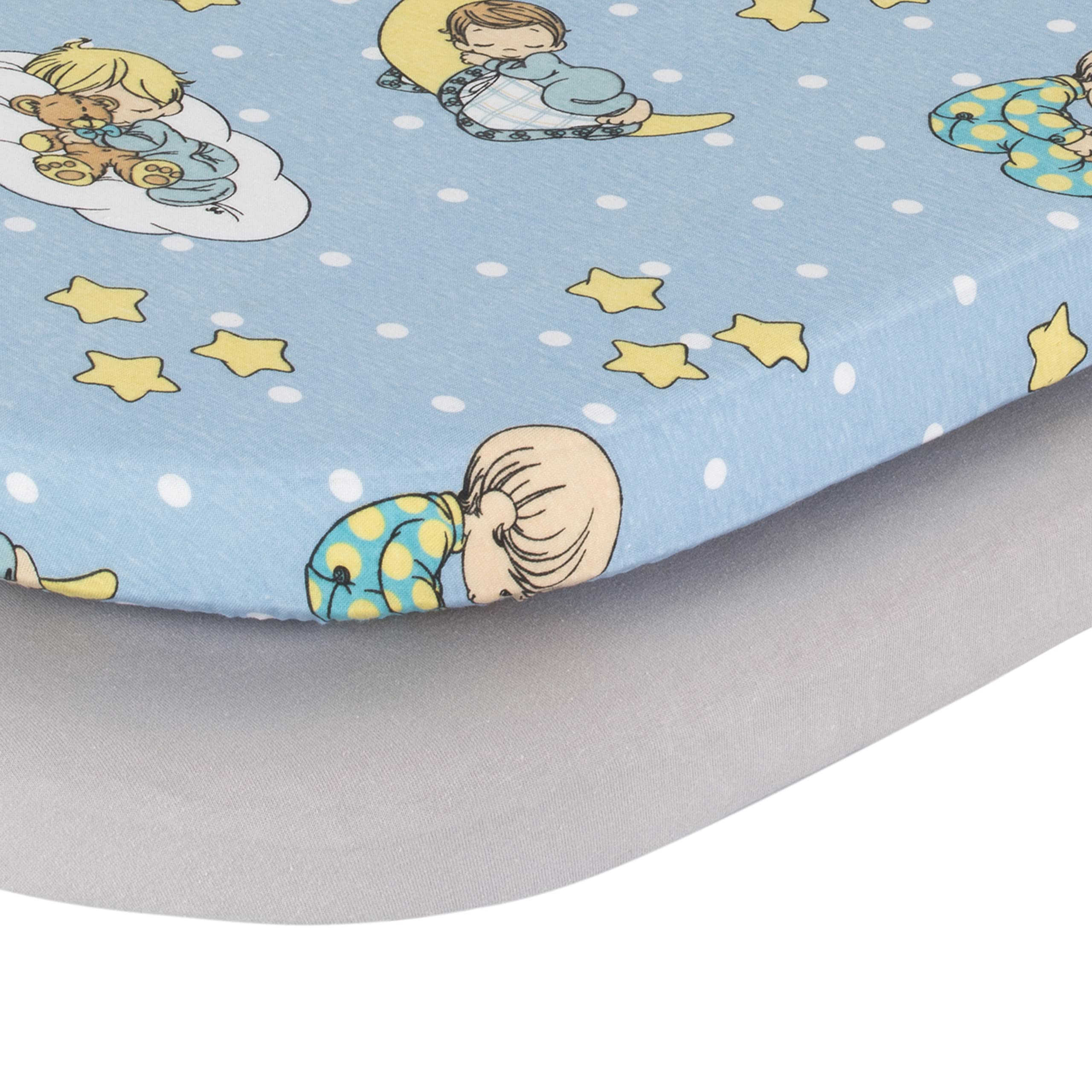 COLORS AND DESIGNS BABIES LOVE: In blue, gray and yellow colors, the Precious Moments baby boy print is colorful and adorable! And, the solid gray sheet is always wonderful as a neutral for baby nursery decors!