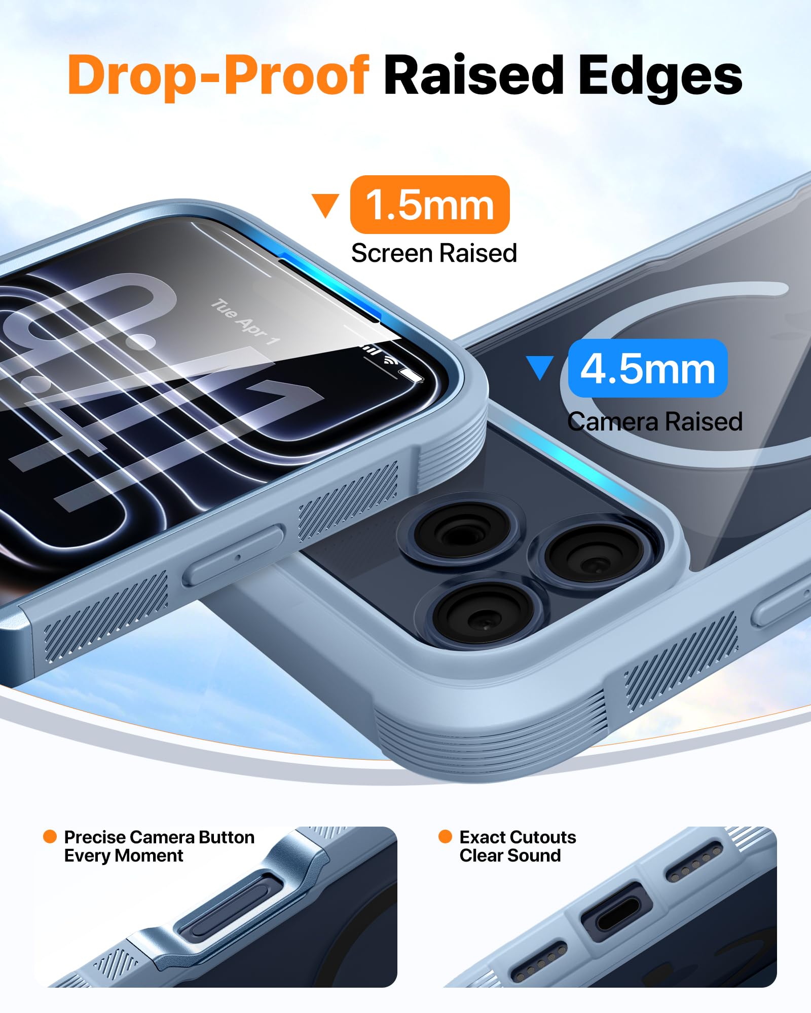 【Extra Protection for the Screen and Camera】 1.5mm raised screen edge and 3.8mm raised camera edge provide extra protection for your phone screen and camera.