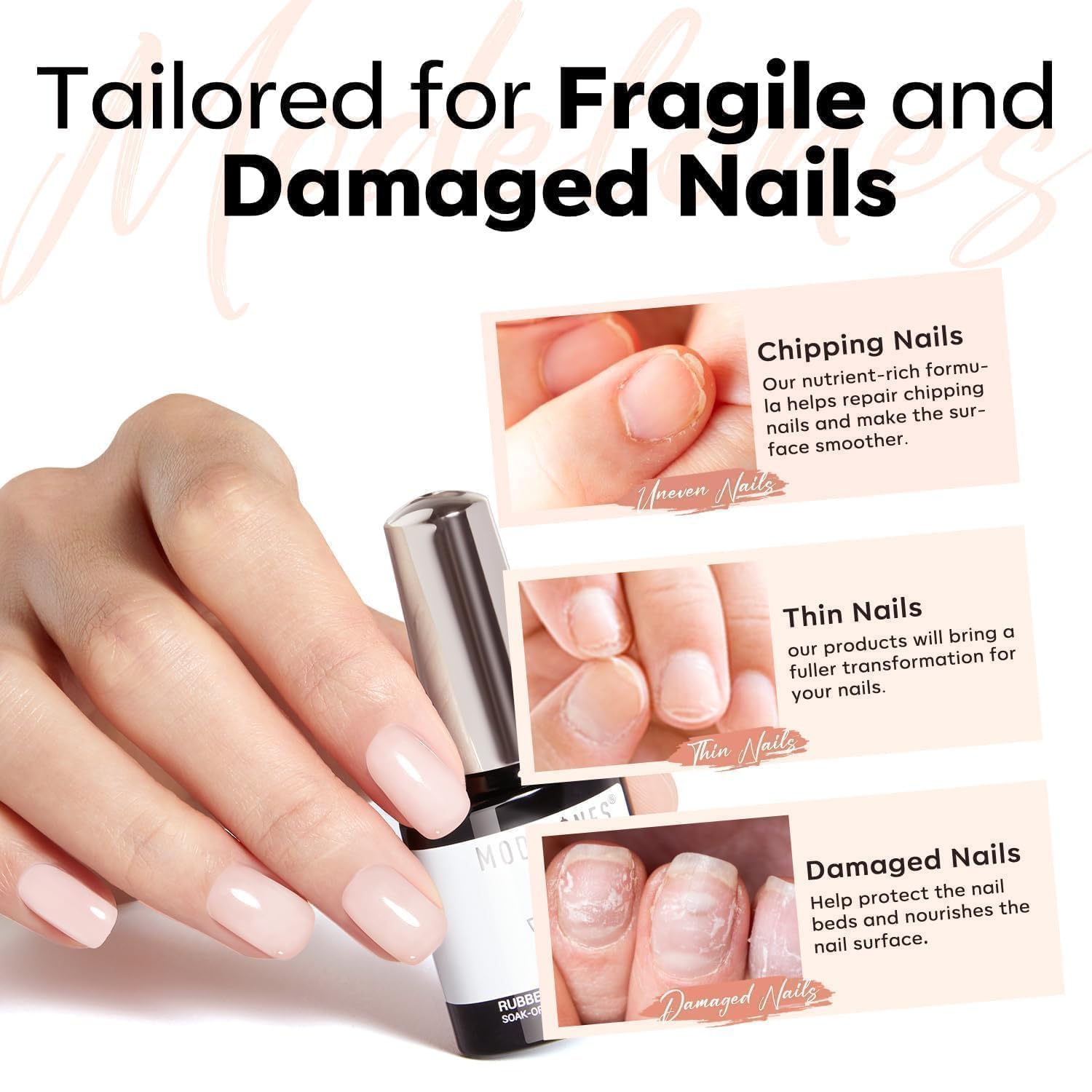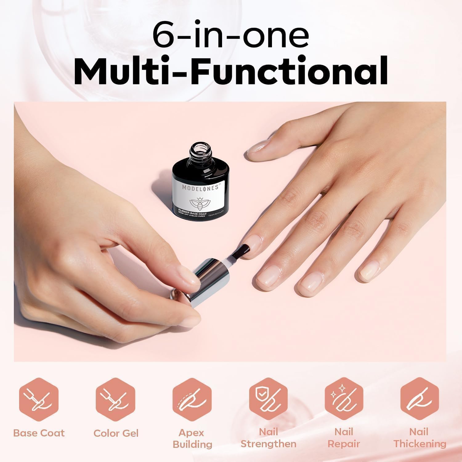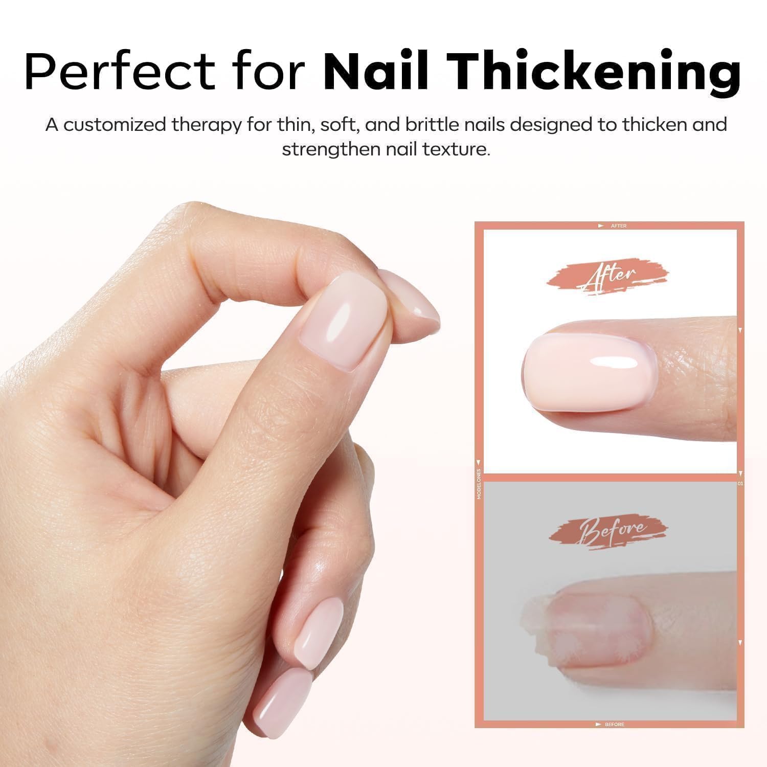 【Healthy Fromula】Modelones rubber base builder gel Contains natural nano-plant resin, 11 toxin-free; No irritating ingredients, low odor, friendly to the nail bed; After 103 formulation stability tests, it provides a good foundation for its adhesive properties and enhances the durability of gel polish.