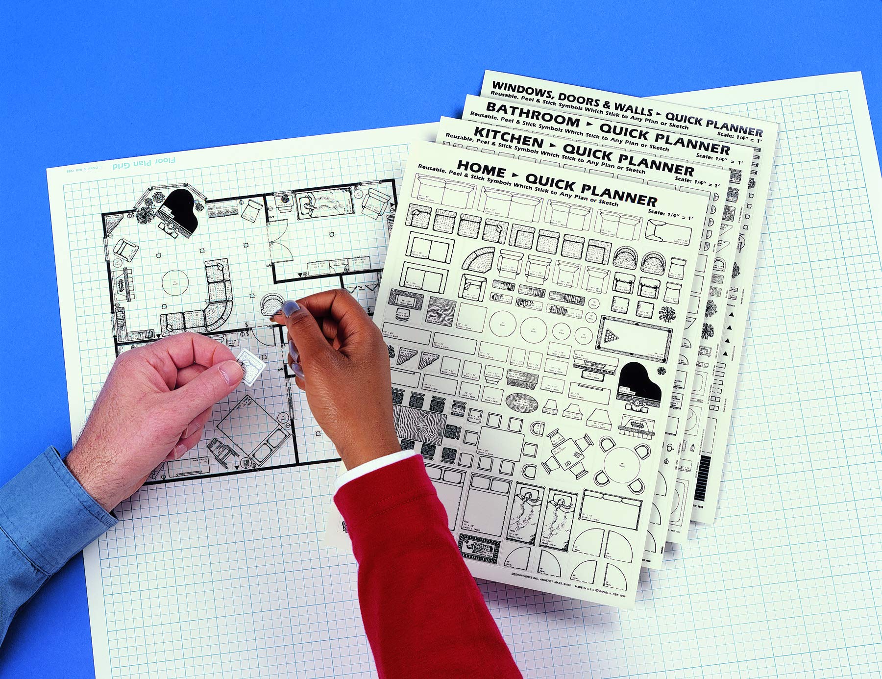 The Home Quick Planner includes 700 precut, reusable peel-and-stick, 1/4-inch scale furniture and architectural symbols, plus a 5,600 square-foot floor plan grid to help you design your own building, remodeling and decorating projects. (Also good for moving.) Symbols include everything you need from tables, chairs, couches, beds and pianos to every standard kitchen cabinet and appliance, an extensive assortment of bathroom fixtures and cabinets (for example, twelve sets of sink designs, six different showers, and a dozen various baths and whirlpools), plus windows, doors, walls, switches, outlets, lights and much more. Simply lift the symbols and arrange them on the floor plan grid to design floor plans, move furniture and make changes. Step-by-step instructions and Design Details: Critical Dimensions & Clearances are provided to help you improve your design and save money. The planner was featured in the Canadian Centre for Architecture, North America's preeminent architecture museum, in an exhibit on design innovation over the past 100-years. This exhibit was also shown at the Wolfsonian Museum in Miami Beach. The planner is part of the three-part design series by Daniel Reif. Sketch your design with the Architect’s Drawing Kit, try out endless floor plan layouts with the Home Quick Planner, and once you have a design that you like, build a three-dimensional model with the 3-D Home Kit.
