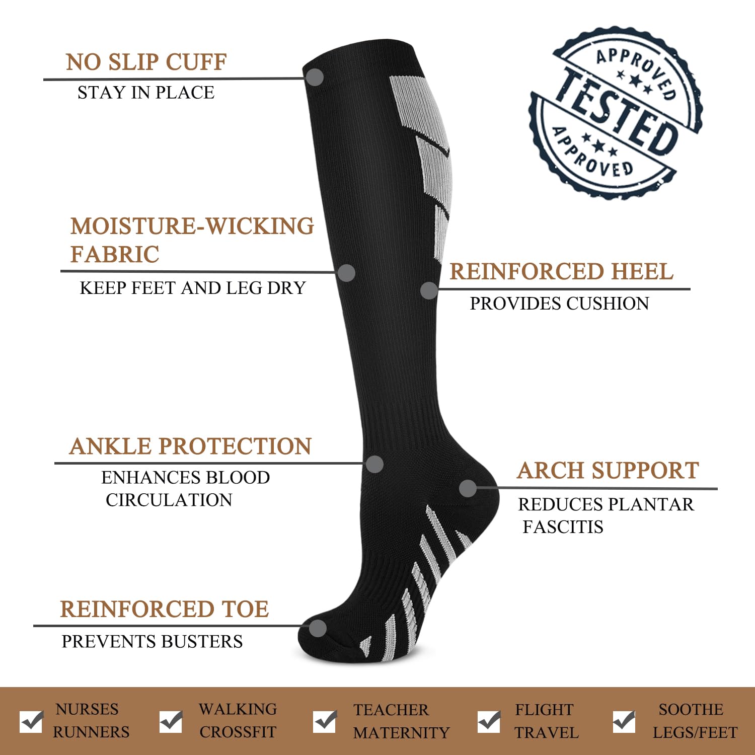 ★Skin-friendly material - compression socks for men and women, made of nylon for breathable comfort. Designed with ergonomics in mind, these socks keep your feet dry all day long. Suitable for any season!