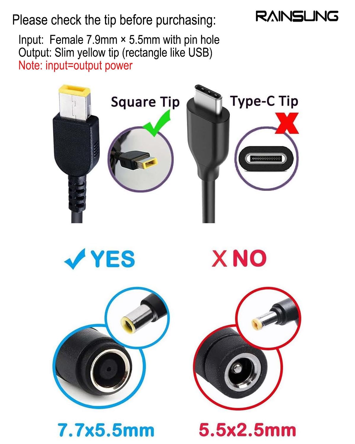 Package & Warranty: You will get 5pcs tip adapter female 7.9mm to rectangle slim yellow tip for lenovo. RAINSUNG will provide you 30-day returned and money back service, if you have any questions or need any help, please contact us directly, we will reply within 24 hours!
