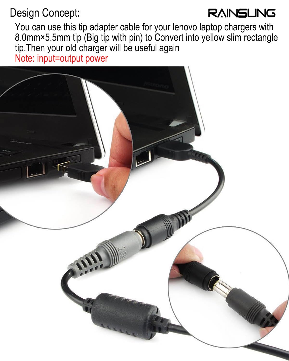 Design Concept: This tip adapter converter cable female 7.9mm to rectangle slim yellow tip designed for Lenovo, it can help you to use your old lenovo laptop power supply with 7.9*5.5mm big round tip to convert into yellow slim square connector cable,Then you can use your old laptop charger for new laptops.