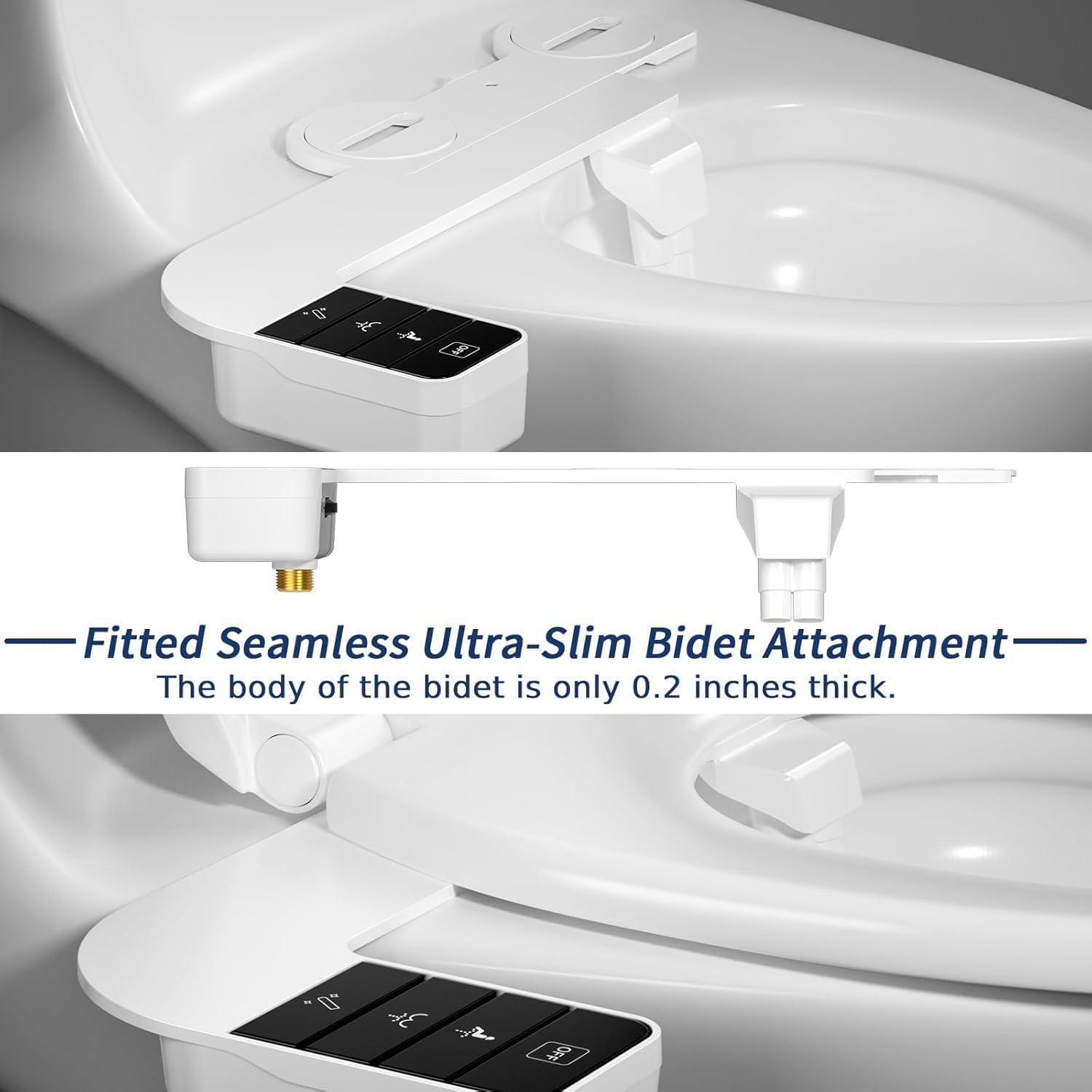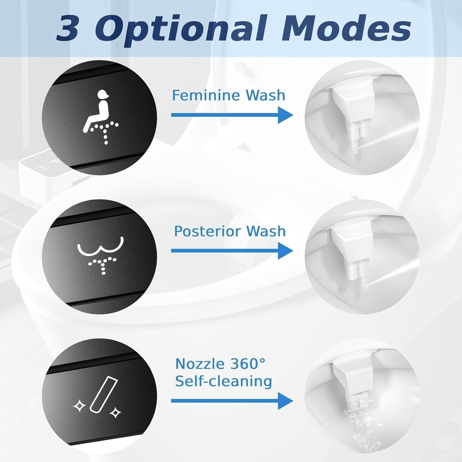 Hygiene Protection: The retractable nozzle automatically retracts behind the protective door after use. Self-cleaning function, cleaning the nozzle thoroughly, maximum protection, and easy maintenance, give you a double hygiene guarantee. The ergonomically designed bidet is only 0.2 inches thick, highly compatible with bidet toilet seat, and fits most toilets.