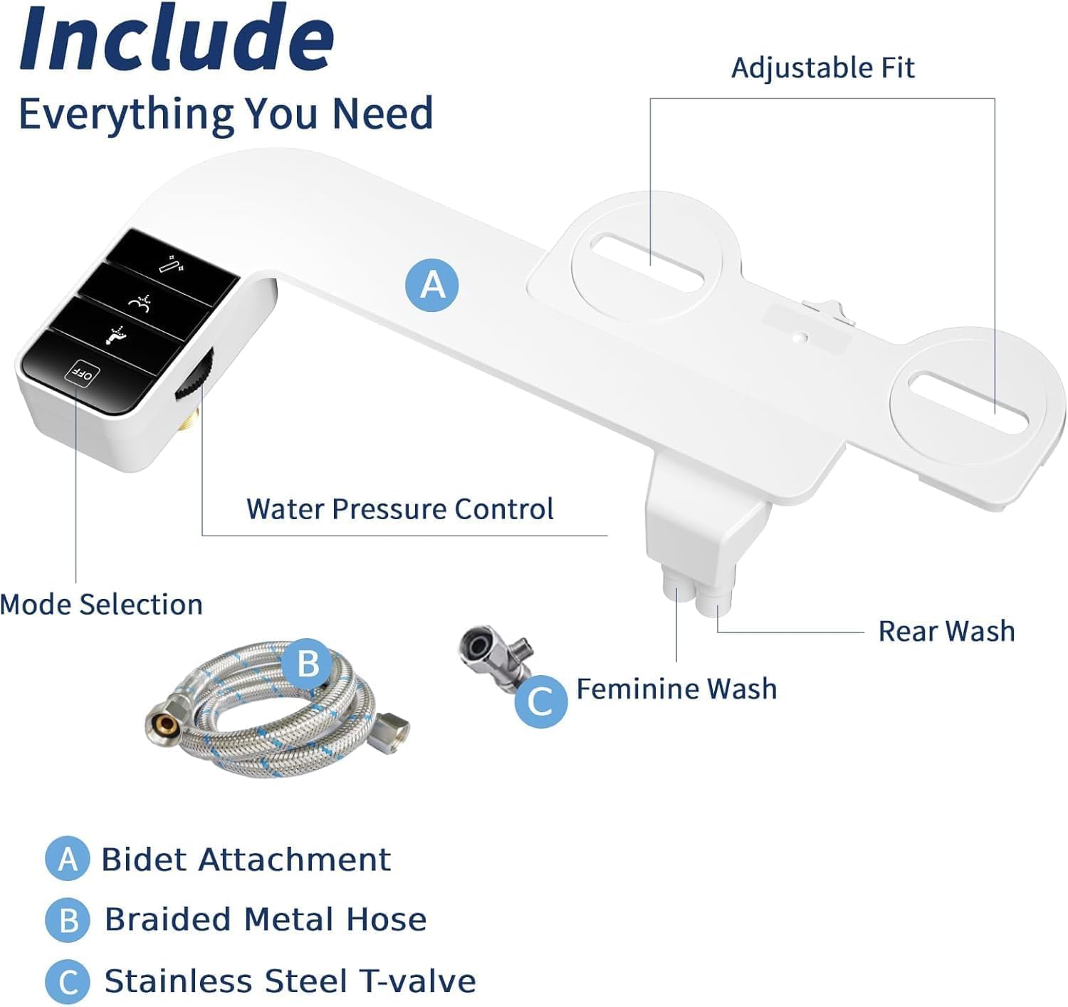 Easy and Quick Installation: Compatible with most toilets. Simply unscrew the toilet seat, then install the bidet attachment, and finally attach the toilet seat and tighten, easily fits into a standard two-piece toilet in minutes, and you're ready to go. Simple and detailed installation instructions for the bidet attachment are provided for you.
