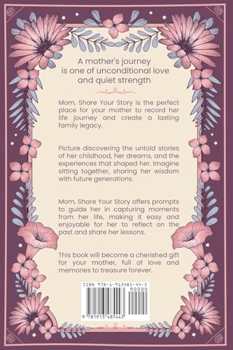A Gift That Lasts a Lifetime—A Keepsake of Love and Memories Your mom's life is a story worth sharing—full of wisdom, love, and cherished moments. "Mom, Share Your Story" isn’t just a journal; it’s an invitation for her to capture her legacy in her own words. With prompts that gently guide her, this beautifully designed keepsake offers an effortless way for her to reflect on her journey, from childhood to today, rekindling memories that will make you smile, laugh, and maybe shed a tear. With over 270 thoughtful prompts, your mom will uncover stories and milestones she may never have shared before. Her answers become a priceless gift that future generations will treasure. Why This Journal is Special: ✓ Over 270 Thoughtful Prompts: Dive into your mom’s childhood, dreams, life lessons, and precious moments. ✓ An Effortless Way to Share Memories: The journal gently guides your mom, making it easy for her to reminisce and record her story. ✓ Heartfelt Personal Note Section: A space for your mom to leave a lasting message, creating a memory you'll cherish forever. ✓ A Meaningful Journey Through Time: Guide her through stages of life, stirring nostalgia and capturing heartfelt memories. ✓ Elegant, Lasting Keepsake: Timeless 6x9 design, perfect for filling out at her own pace and passing down as a family heirloom. ✓ Perfect for All Moms: Thoughtful prompts suited for moms of any age, making it a meaningful gift for every family. Don’t wait until the stories are forgotten. Give your mom the gift of reflection, and yourself the gift of knowing her story. "Mom, Share Your Story" is a priceless treasure that will bring joy now and for generations to come. Order your copy today, and start preserving the memories that matter most.