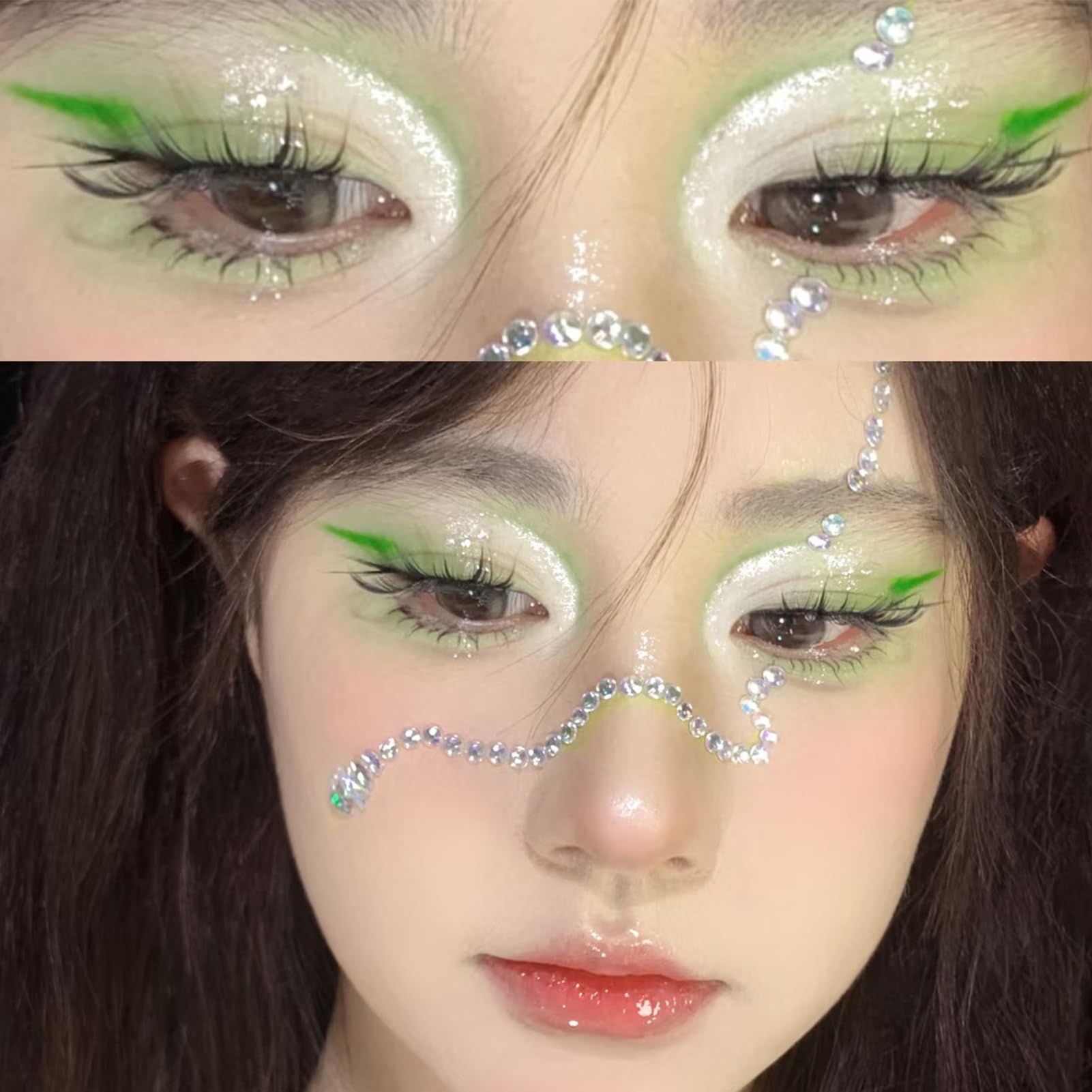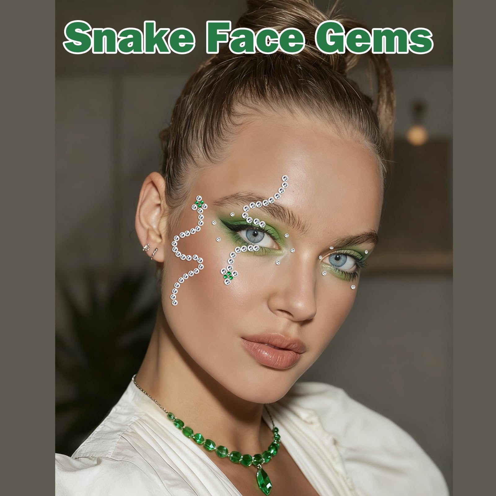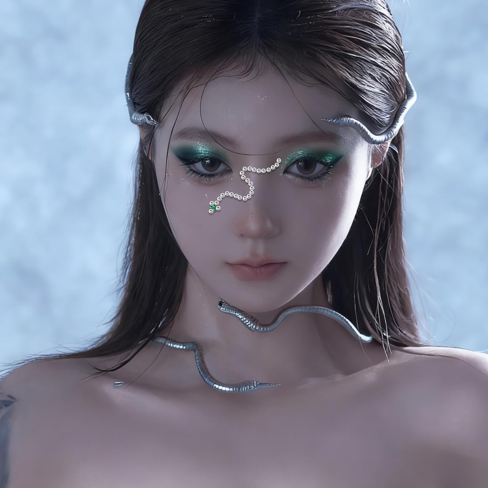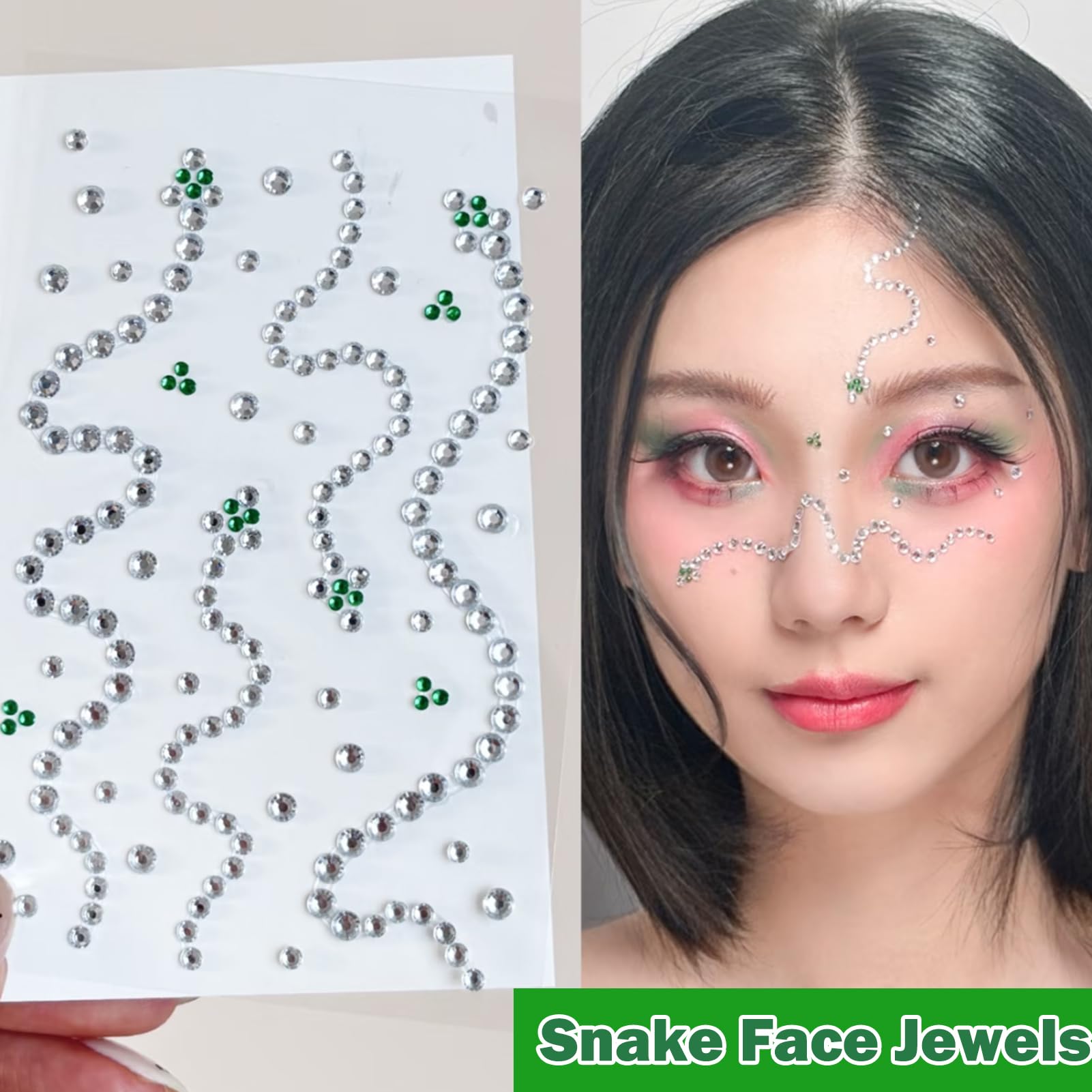 đăFace Gems Festival Accessories Package Includedă: Snake-shaped simulation art face gems, sparkling delicate silver drills arranged in curved and flexible curves, embellished with green eyes, with a strong visual impact, whether it's a cosplay party or Christmas, it can give you an unparalleled exotic style. The snake-shaped elements are even more charming.