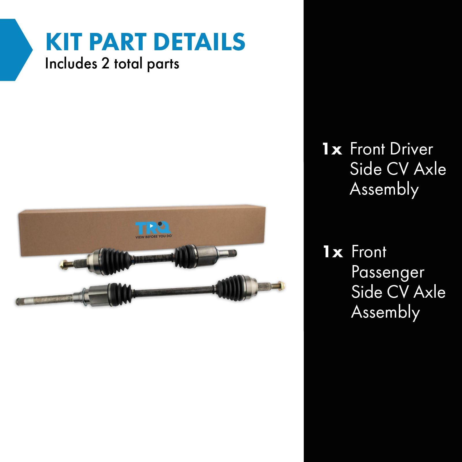 2 Piece CV Axle Assembly Set Kit Includes (1) Front Driver Side CV Axle Assembly (1) Front Passenger Side CV Axle Assembly Fitment Compatible with: 2011-21 Jeep Grand Cherokee V6 3.6L All Wheel Drive with 1 Speed Transfer Case Front Driver & Passenger Side Compatible with: 2011-22 Dodge Durango V6 3.6L All Wheel Drive Front Driver & Passenger Side Compatible with: 2022 Jeep Grand Cherokee WK All Wheel Drive with 1 Speed Transfer Case Front Driver & Passenger Side Product Attributes Quantity: 2 Piece Product Features 100% New: Manufactured to tighter tolerances for extended service life Neoprene Boots: Improved durability compared to stock material Moly Greased: Specifically-designed grease shield to reduce premature wear Application Specific Design: No modification Item Details TRQ CV (constant velocity) drive axles are manufactured using premium raw materials designed to restore original performance. TRQ CV drive axles are new, so there is no core charge with your TRQ purchase. TRQ-designed drive axles utilize neoprene boots, moly grease, stainless steel clamps, and heat-treated ball tracks to ensure extended service life. Each TRQ axle is application-specific so each spline and thread will mate properly for a seamless fit. All products are fit and road-tested in our Massachusetts R&D facility to ensure we deliver on our promise of Trusted Reliable Quality. Reference Numbers 04578885AC 447-00511R 447-00512L 4578884AB 4578884AC 4578885AC 66-3758 66-3759 663758 663759 NCV10063 NCV10066