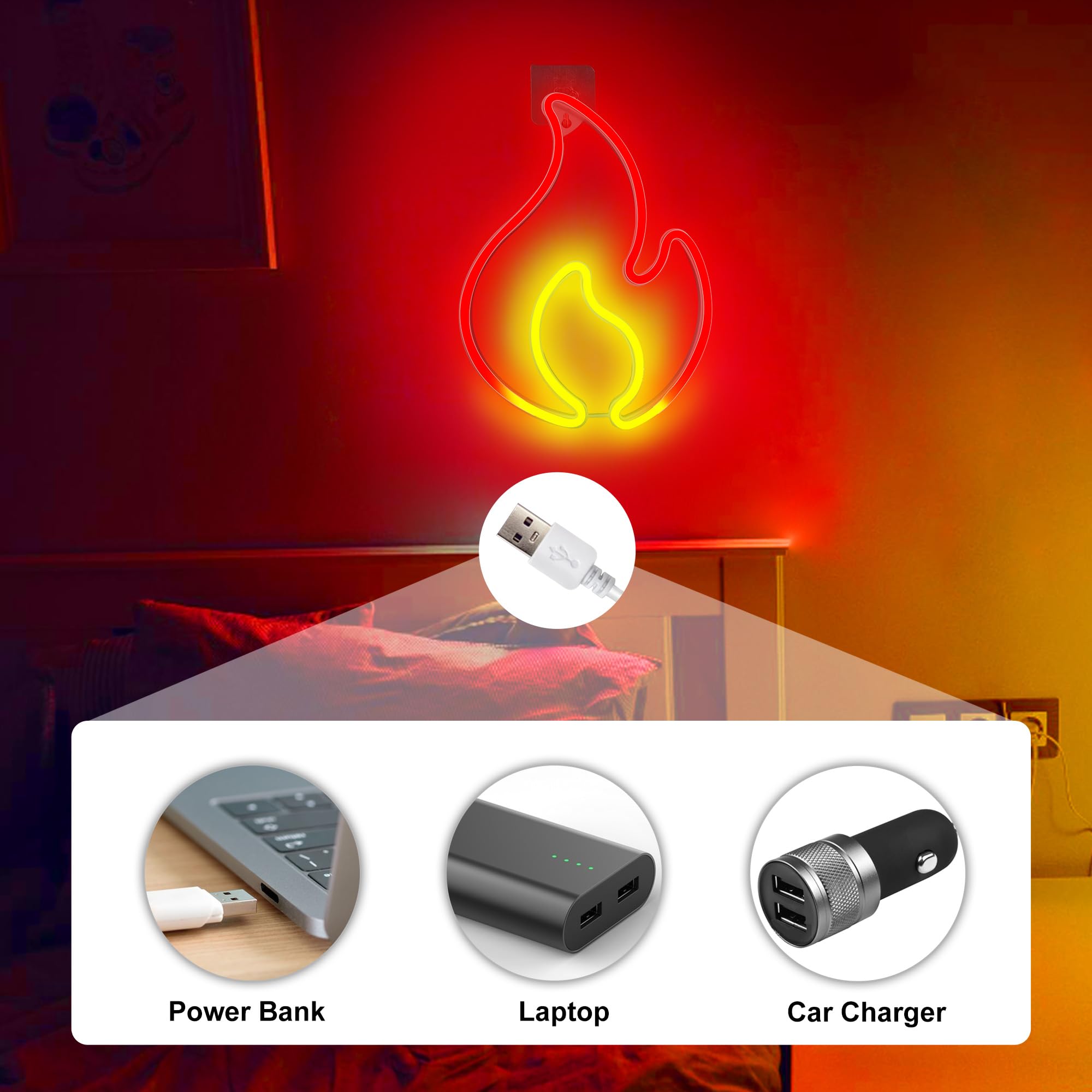 🔌【USB/Battery Operation】The Flaming Fire LED neon sign light comes with 3 x AA battery box ( 3 x AA battery NOT included) and USB cable. You can either use the battery pack or plug it to USB port, power bank, PC etc. And controlled by flipping the ON/OFF switch on the battery box. Your new flaming cool neon fire sign is ready to shine!