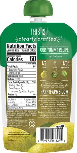 Our Stage 2 baby food pouches introduce baby to new, yummy organic ingredients. Full of flavor, this superfood blend has 3g of fiber & is made with 3 simple ingredients: pear, spinach & kale. Baby will enjoy new tastes & you'll love the wholesome recipe.