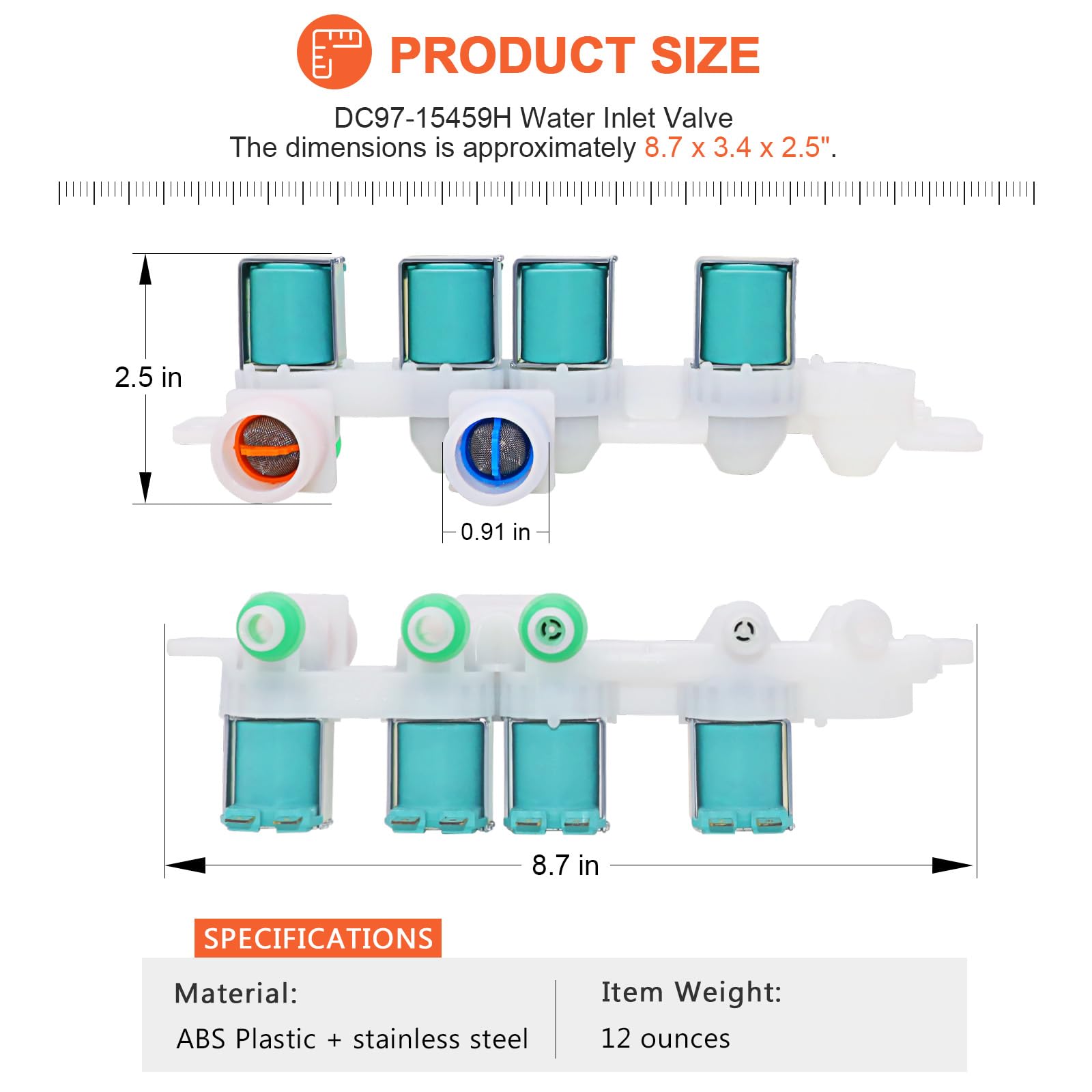 【DC97-15459H WATER INLET VALVE】--- The package includes 1 x DC97-15459H Water Inlet Valve. The Water inlet valve DC97-15459H is for washer, controls the water flow into the washer. The DC97-15459H samsung washer water valve supply voltage is AC 110/120V and the power is 60Hz. The size is 8.7" x 3.4" x 2.5". The DC97-15459H Samsung Water Inlet Valve has 4 solenoid coils, designed to fit specific Samsung manufactured washer models. ►Please note the distinction between the DC97-15459G and DC97-15459H water valves. The DC97-15459H Washer Water Valve features 4 solenoid valves, whereas the other variant has 5 solenoid valves. This will help avoid wasting time by purchasing the incorrect product