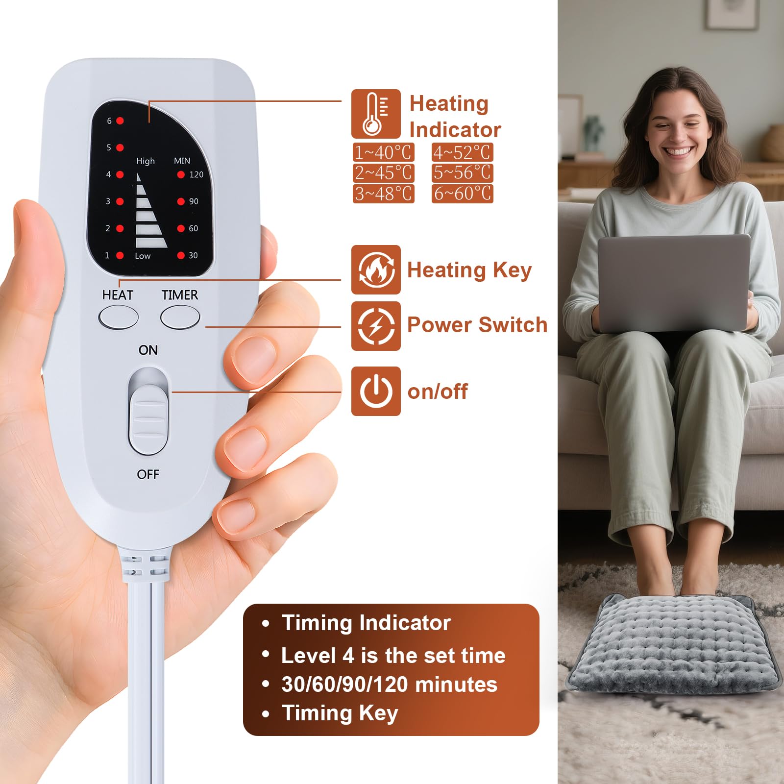 【6 Temperature & 4 Timer Settings】Our electric heated foot warmer offers 6 heat settings (40°C/104°F to 60°C/140°F), so you can pick the perfect warmth based on the room temp and your preference. It also comes with an auto-shutoff feature with 30/60/90/120-minute options—saves energy and prevents burns from overheating.