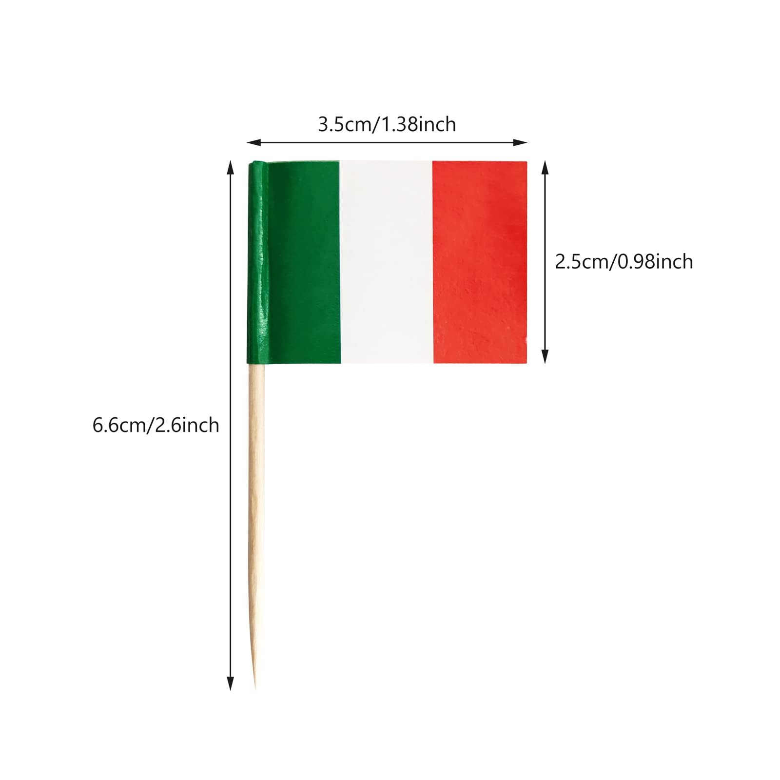 Elevate your parties with these 100 Pack Italy Flag Toothpick Flags by Newkita. Each flag measures 1.4 x 1 inches and is mounted on a 2.5-inch wood toothpick, making them perfect for cocktail picks, cupcake toppers, or mini stick food decorations. Made of durable paper and wood, these country picks are ideal for both children and adult birthday parties, game events, school games, sports events, wedding dinners, national holidays, and bar celebrations. Easy to use and attractive, they can be used to garnish appetizers or as decorative cake toppers. These toothpick flags are not only versatile but also add a touch of elegance to any occasion. With three different themes - Birthday, Wedding, and Cocktail Party - these party decorations are a must-have for any event. The package includes 100 toothpick flags, providing ample decorations for your celebrations. Follow the care instructions for long-lasting use.