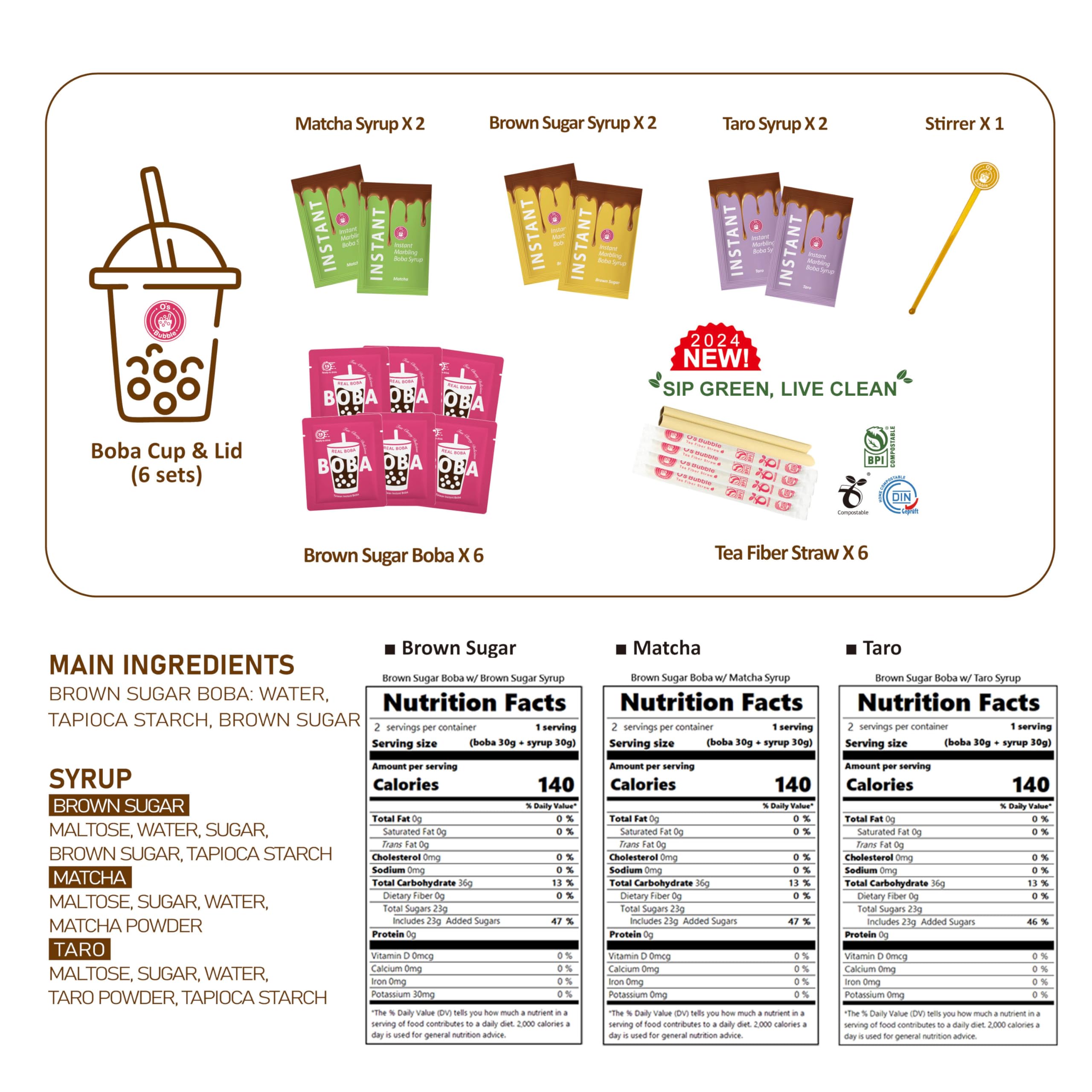 Includes variety 3 flavors of boba pack! Featuring black tea, brown sugar, matcha, and taro flavors, you can mix and match your boba with your favorite drinks to make all kinds of delicious treats!