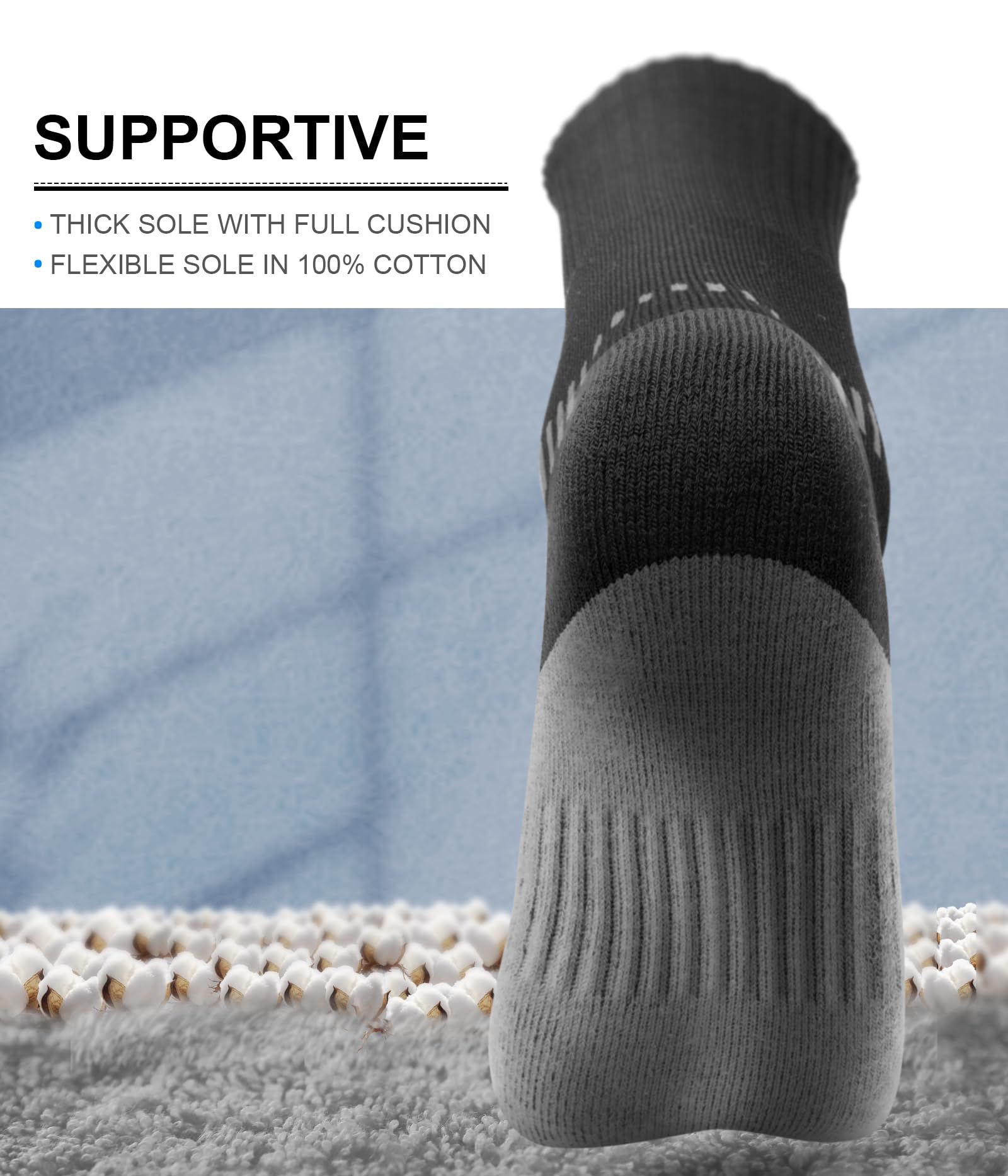 SURPORTIVE--Soft yarns makes it super friendly to the feet,full cushioned sole and arch support band gives the best shock absobing,these socks make you ever step comfortable and easier;