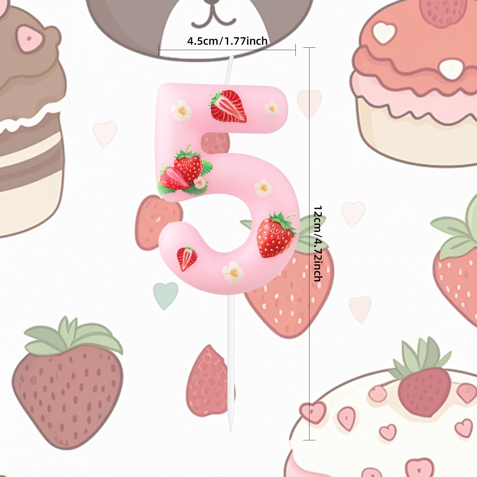 CANDLES INFORMATION:Comes with berry sweet strawberry themed birthday candles-number 4 candles.candles size is approx of 2.36in / 6cm*1.37in / 3.5cm,and a total height of 4.3in/11cm.candles size as cake decoration for most birthday and anniversary cake 🍓