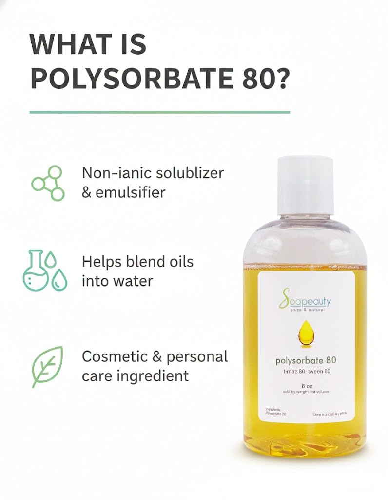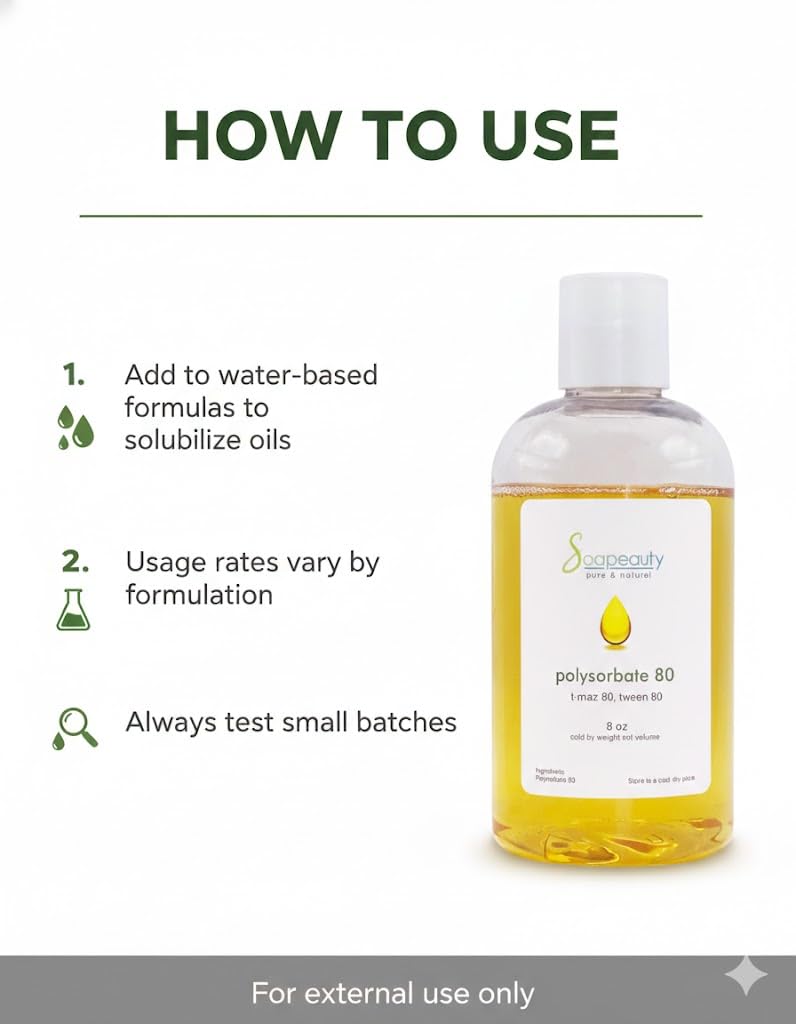 SOAPEAUTY PREMIUM POLYSORBATE 80, T-MAZ 80, TWEEN 80: Polysorbate 80 is a common fragrance and essential oil solubilizer as well as an emulsifying agent. It is soluble in water and alcohol and insoluble in oils. It is typically a co-emulsifier that is used both as a viscosity modifier and a dispersing agent.