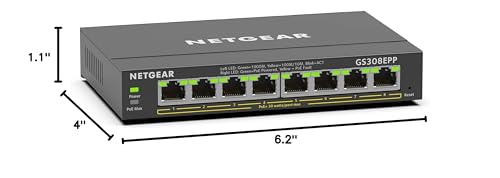 Introducing the NETGEAR GS308EPP PoE+ Gigabit Ethernet Smart Managed Plus Switch with 8 ports PoE+ and a total PoE budget of 124W to power PoE applications such as VoIP phones, IP cameras for surveillance, wireless access points and more. GS308EPP also includes basic and advanced network management features to help optimize the performance of business networks.