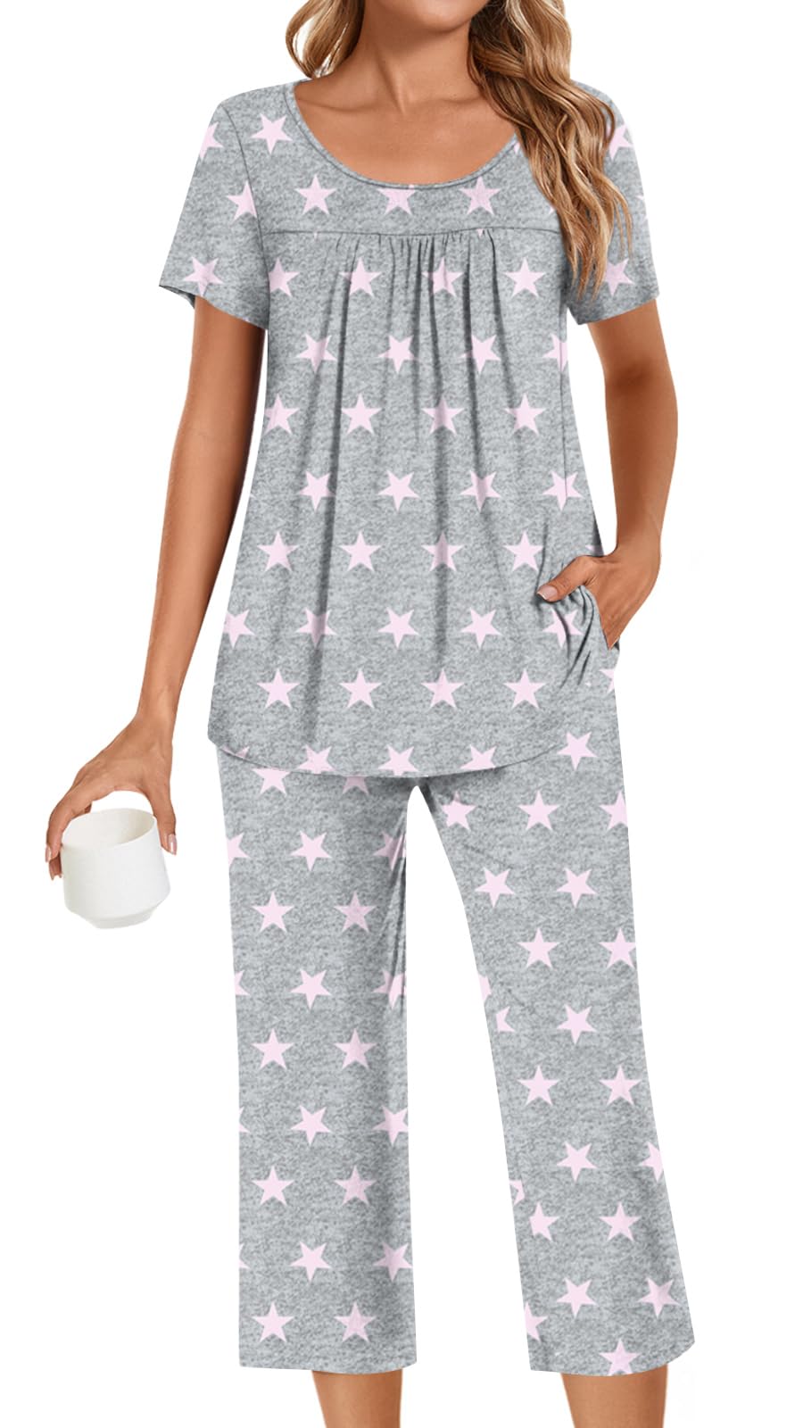 Comfortable pajama set: This casual sleeveless pajama set is made of 95% rayon with 5% spandex. This material is soft and comfortable, has great stretch, washes and dries well, and doesn't wrinkle