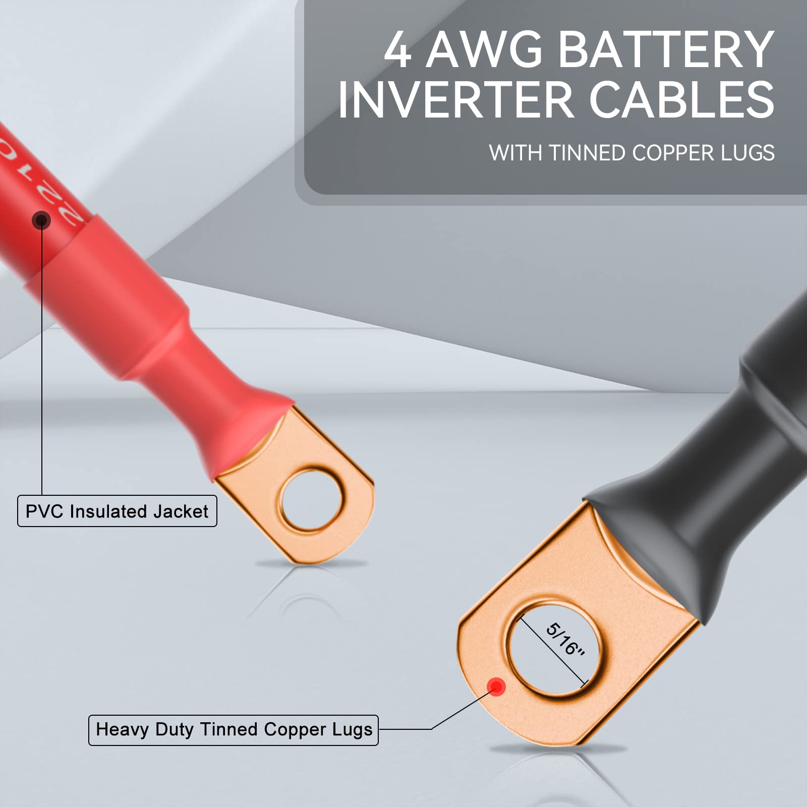 【What You Get】1 Pair 10 feet 4 AWG/Guage Pure Copper Battery Cable with Heavy Duty Tinned Copper Lugs, fit 5/16'' stud/diameter mounting holes