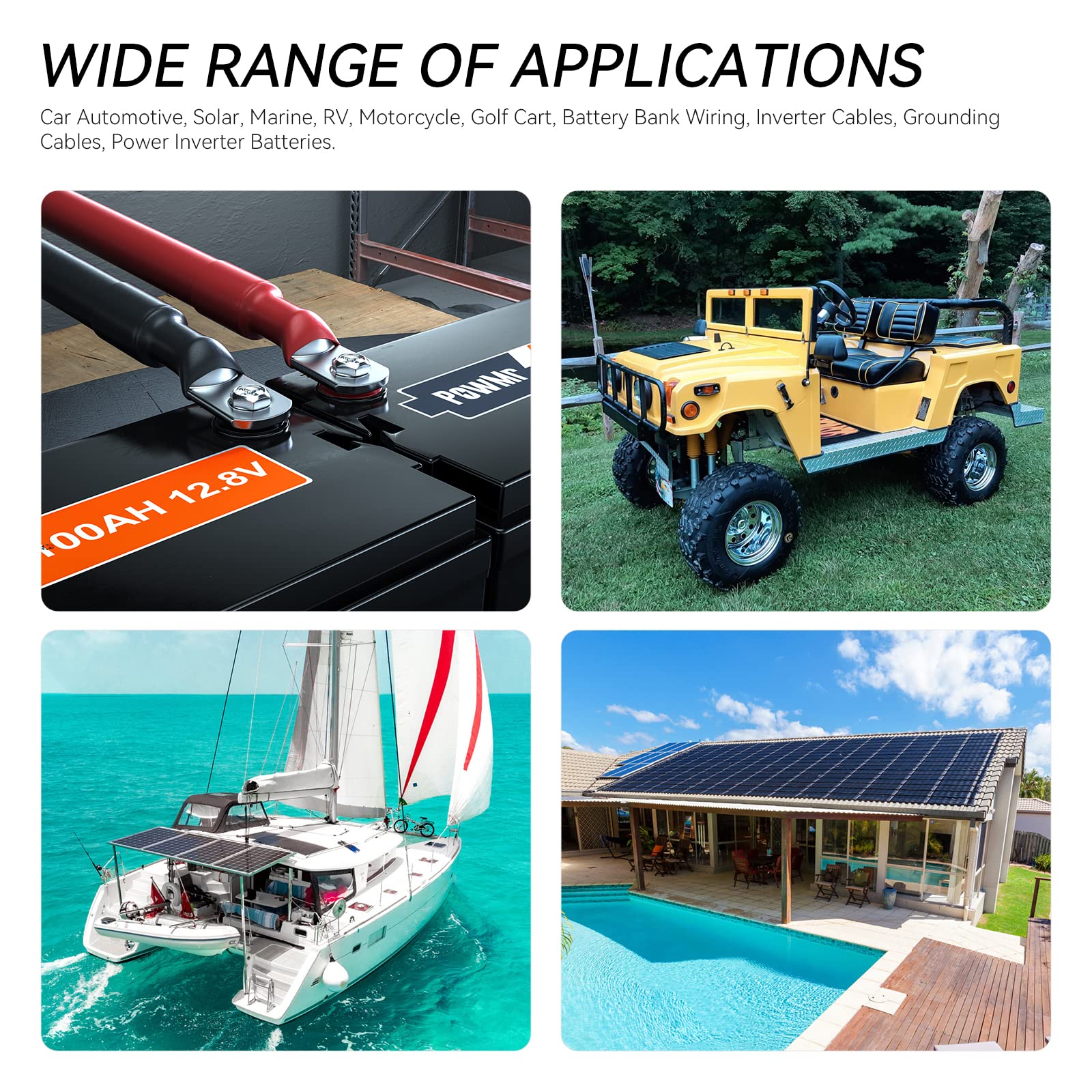 【Wide Applications:】These 4awg Battery Inverter Cable works greeting for truck, RVs, trailer, golf carts, solar systems, boats, marine, home applications, Vehicle, Motorcycle, DIY Electrical Wirings, and Other power Applications